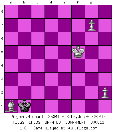 Last move : 1-0 2011 February 19 22:26:38 [Event "FICGS__CHESS__UNRATED_TOURNAMENT__000013"] [Site "FICGS"] [Date "2010.12.30"] [Round "1"] [White "Aigner,Michael"] [Black "Riha,Josef"] [Result "1-0"] [WhiteElo "2604"] [BlackElo "2094"] 1.e4 e5 2.Nf3 Nc6 3.Bc4 Bc5 4.c3 Nf6 5.d3 d6 6.O-O a6 7.Bb3 Be6 8.Bxe6 fxe6 9.Qb3 d5 10.Bg5 h6 11.Bh4 O-O 12.Nbd2 Qd7 13.Rae1 dxe4 14.Nxe4 Bb6 15.Nxf6+ gxf6 16.d4 Na5 17.Qc2 exd4 18.cxd4 f5 19.Ne5 Qd6 20.Qc3 Kh7 21.d5 exd5 22.b4 d4 23.Qf3 Rae8 24.bxa5 Bxa5 25.Nc4 Qc5 26.Rxe8 Rxe8 27.Nxa5 Qxa5 28.Qxb7 Re1 29.f3 Rxf1+ 30.Kxf1 Qxa2 31.Qxc7+ Kg6 32.Qb6+ Kh7 33.Qxd4 Qe6 34.Be1 Kg8 35.Bc3 Kf8 36.Qg7+ Ke8 37.Qe5 Qxe5 38.Bxe5 a5 39.g4 fxg4 40.fxg4 Kf7 41.Kf2 Ke6 42.Bg7 a4 43.Bxh6 Ke5 44.Kf3 Kd4 45.Kf4 Kd5 46.Kf5 a3 47.Bc1 a2 48.Bb2 Kc4 49.g5 Kb3 50.Be5 Kc2 51.g6 Kb1 52.g7 a1R 53.Bxa1 1-0 Giuoco Piano Kingside Castling by player White (move 6) Kingside Castling by player Black (move 11) 10 pieces endgame at move 37 : White KBPPP , Black KQPPP WHITE : King + 1 Bishop 3 Pawns BLACK : King + 1 Queen 3 Pawns 9 pieces endgame at move 38 : White KBPPP , Black KPPP WHITE : King + 1 Bishop 3 Pawns BLACK : King + 3 Pawns 8 pieces endgame at move 39 : White KBPP , Black KPPP WHITE : King + 1 Bishop 2 Pawns BLACK : King + 3 Pawns 7 pieces endgame at move 40 : White KBPP , Black KPP WHITE : King + 1 Bishop 2 Pawns BLACK : King + 2 Pawns 6 pieces endgame at move 43 : White KBPP , Black KP WHITE : King + 1 Bishop 2 Pawns BLACK : King + 1 Pawn Promotion Rook by player Black (move 52) 5 pieces endgame at move 53 : White KBPP , Black K WHITE : King + 1 Bishop 2 Pawns BLACK : King + Player White won this chess game. Follow this game move after move (download)The chessboard is the world, the pieces are the phenomena of the Universe, the rules of the game are what we call the laws of Nature and the player on the other side is hidden from us. (Thomas Huxley) Wenn Dein Gegner dir ein Remis anbietet, versuch herauszufinden, weshalb er glaubt schlechter zu stehen. (Nigel Short) Tu eres para mi la Reina en d8 y yo soy el Peón en d7!!. (GM Eduard Gufeld) A ce moment-là, je menaçais de comprendre la position ! (Clément L'Heureux) Whoever said the pen is mightier than the sword obviously never encountered automatic weapons. (US General Douglas MacArthur)