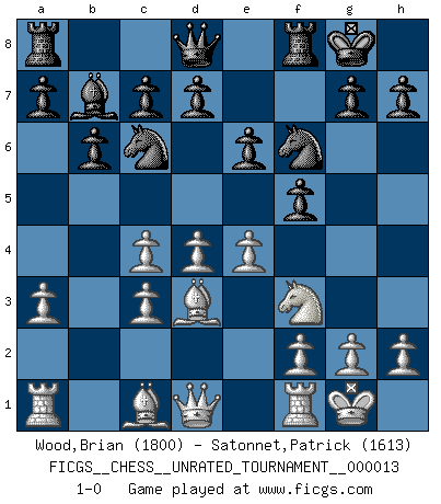 Last move : 1-0 2011 March 14 12:14:2 [Event "FICGS__CHESS__UNRATED_TOURNAMENT__000013"] [Site "FICGS"] [Date "2010.12.30"] [Round "1"] [White "Wood,Brian"] [Black "Satonnet,Patrick"] [Result "1-0"] [WhiteElo "1800"] [BlackElo "1613"] 1.c4 b6 2.d4 Bb7 3.Nc3 e6 4.Nf3 Bb4 5.e3 f5 6.Bd3 Nf6 7.O-O O-O 8.a3 Bxc3 9.bxc3 Nc6 10.e4 1-0 This chess game has been lost on time (started : 2010.12.30 23:35:11) English Opening Kingside Castling by player White (move 7) Kingside Castling by player Black (move 7) Player White won this chess game. Follow this game move after move (download)You know you're going to lose. Even when I was ahead I knew I was going to lose. - On playing against Fischer. (Andrew Soltis) Privat ist Kortschnoi kein schlechter Mensch, sehr sympathisch. Aber während des Spiels ist er grausam. Er will dich töten. (Miguel Najdorf) Si tu oponente te ofrece un empate, trata de averiguar porque piensa él que esta en una posición peor. (Nigel Short) Que feriez-vous si vous étiez en train de jouer aux échecs et que la fin du monde arrive ? Je continuerais à jouer. (Saint Borromée) 'preceded by its own quotation yields a falsehood' preceded by its own quotation yields a falsehood. (W. V. O. Quine - Set Theory And Its Logic, 1953)