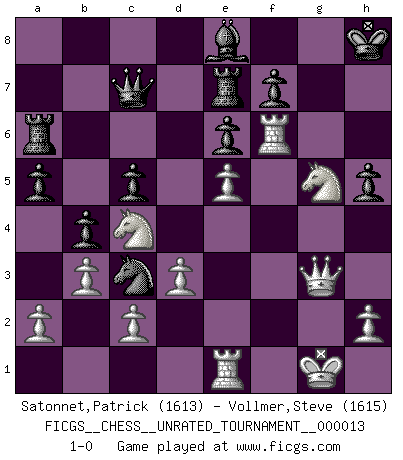Last move : 1-0 2011 June 11 20:36:22 [Event "FICGS__CHESS__UNRATED_TOURNAMENT__000013"] [Site "FICGS"] [Date "2010.12.30"] [Round "1"] [White "Satonnet,Patrick"] [Black "Vollmer,Steve"] [Result "1-0"] [WhiteElo "1613"] [BlackElo "1615"] 1.e4 c5 2.f4 d6 3.Nf3 Nc6 4.Bb5 Bd7 5.O-O a6 6.Bxc6 Bxc6 7.Nc3 Nf6 8.d3 g6 9.Qe2 Bg7 10.Bd2 O-O 11.Rae1 e6 12.b3 Qc7 13.Nd1 b5 14.Bc3 b4 15.Ba1 a5 16.Ne3 Rfe8 17.e5 Nd5 18.exd6 Qxd6 19.Nc4 Qc7 20.Be5 Bxe5 21.fxe5 Re7 22.Ng5 Nc3 23.Qe3 Be8 24.Qh3 h5 25.g4 Ra6 26.gxh5 gxh5 27.Qg3 Kh8 28.Rf6 1-0 Sicilian : Grand Prix attack Kingside Castling by player White (move 5) Kingside Castling by player Black (move 10) Player White won this chess game. Follow this game move after move (download)For me, Chess is life and every game is like a new life. Every Chess player gets to live many lives in one lifetime. (Eduard Gufeld) Ich verstehe Aljechins Kombinationen ganz gut; aber woher er diese Angriffschancen bekommt und wie er die Eröffnung behandelt das ist für mich ein Buch mit sieben Siegeln. (Rudolf Spielmann) Yo considero que Fischer es uno de los expertos mas grandes de aperturas de siempre. (Keith Hayward) Demandez au pauvre Cg1 ce qu'il en pense. Eduard Gufeld à propos de la variante Saemisch de l'Est-Indienne. I don't believe in psychology. I believe in good moves. (Bobby Fischer)