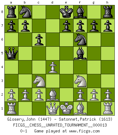 Last move : 0-1 2011 January 18 2:0:35 [Event "FICGS__CHESS__UNRATED_TOURNAMENT__000013"] [Site "FICGS"] [Date "2010.12.30"] [Round "1"] [White "Glosery,John"] [Black "Satonnet,Patrick"] [Result "0-1"] [WhiteElo "1447"] [BlackElo "1613"] 1.e4 d5 2.exd5 Qxd5 3.Nc3 Qa5 4.d4 Nf6 5.Bd2 Bf5 6.Nf3 c6 0-1 Scandinavian (centre counter) defense Player Black won this chess game. Follow this game move after move (download)First-class players lose to second class players because second-class players sometimes play a first-class game. (Tarrasch) Es ist nicht das erste mal, dass sich die FIDE dem Arabischen Geld gebeugt hat (über die FIDE WM 2004 in Lybien). (Larry Evans) Por esta medida (el intervalo entre Fischer y sus contemporaneos), yo le considero el mas grande campeón mundial. (Garry Kasparov) Il a essayé de se convaincre qu'il pourrait empêcher toutes les erreurs et ne jamais perdre. L'horreur ! Gary Kasparov au sujet de Robert Fischer. The difference between perseverance and obstinacy is that one comes from a strong will, and the other from a strong won't. (Henry Ward Beecher)