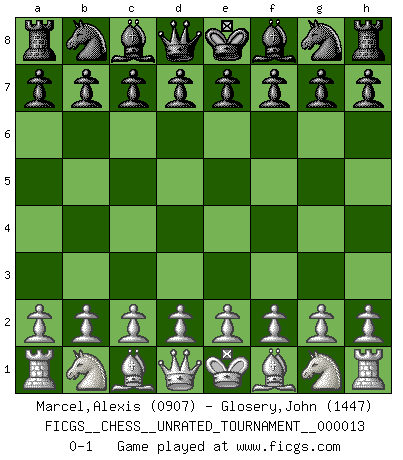 Last move : 0-1 2011 January 1 14:33:21 [Event "FICGS__CHESS__UNRATED_TOURNAMENT__000013"] [Site "FICGS"] [Date "2010.12.30"] [Round "1"] [White "Marcel,Alexis"] [Black "Glosery,John"] [Result "0-1"] [WhiteElo "0907"] [BlackElo "1447"] 0-1 Player Black won this chess game. Follow this game move after move (download)A thorough understanding of the typical mating continuations makes the most complicated sacrificial combinations leading up to them not only not difficult, but almost a matter of course. (Siegbert Tarrasch) Der Partner hat auch seine Existenzberechtigung. (Savielly Grigorievitsch Tartakower) Los finales de Peón son del Ajedrez lo que el cesped es del Golf. (Cecil Purdy) Les Echecs ont trois composantes : le temps, l'espace et le matériel en dernier. (Mikhail Tal) There are two kinds of tragedy in this world, one is not getting what you want and the other is getting. (Lord of war)