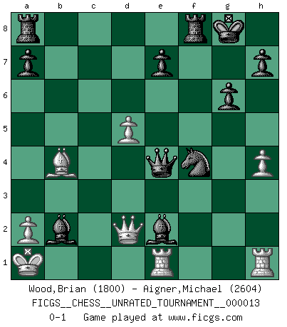 Last move : 0-1 2011 April 11 21:26:7 [Event "FICGS__CHESS__UNRATED_TOURNAMENT__000013"] [Site "FICGS"] [Date "2010.12.30"] [Round "1"] [White "Wood,Brian"] [Black "Aigner,Michael"] [Result "0-1"] [WhiteElo "1800"] [BlackElo "2604"] 1.c4 g6 2.d4 Bg7 3.Nc3 Nf6 4.e4 d6 5.f3 O-O 6.Be3 c5 7.Nge2 Nc6 8.Qd2 Qa5 9.d5 Ne5 10.Nc1 Bd7 11.Be2 Qa6 12.h4 Nh5 13.f4 Nxc4 14.Bxc4 Qxc4 15.N1e2 f5 16.exf5 Bxf5 17.O-O-O b5 18.g4 Bxg4 19.Kb1 b4 20.Na4 Bxe2 21.Rc1 Qe4+ 22.Ka1 Bb5 23.Nxc5 dxc5 24.Bxc5 Nxf4 25.Rce1 Be2 26.Bxb4 Bxb2+ 0-1 English Opening Kingside Castling by player Black (move 5) Queenside Castling by player White (move 17) Player Black won this chess game. Follow this game move after move (download)Spassky will not be psyched out by Fischer. (Mike Goodall) Wenn ich Weiß habe gewinne ich weil ich Weiß habe, wenn ich Schwarz habe gewinne ich weil ich Bogoljubov bin. (Efim Bogoljubov) Fischer es el jugador mas fuerte del mundo. De hecho, el jugador mas fuerte que jamas haya existido. (Larry Evans) On entre au jeu d'Echecs comme on entre en Religion. Pour le joueur d'Echecs, la partie d'Echecs c'est l'office, la messe, le défilé du 1er Mai, le dépôt de gerbe au Monument aux Morts. C'est un drame sacré. (Michel Roos) The leaves of memory seemed to make a mournful rustling in the dark. (Henry Wadsworth Longfellow)