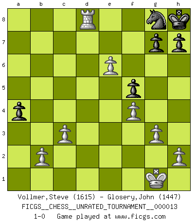 Last move : 1-0 2011 January 13 19:18:43 [Event "FICGS__CHESS__UNRATED_TOURNAMENT__000013"] [Site "FICGS"] [Date "2010.12.30"] [Round "1"] [White "Vollmer,Steve"] [Black "Glosery,John"] [Result "1-0"] [WhiteElo "1615"] [BlackElo "1447"] 1.e4 e6 2.d4 d5 3.Nc3 Bb4 4.e5 a6 5.Nf3 c5 6.Be3 Nc6 7.Be2 Nge7 8.O-O Nf5 9.a3 cxd4 10.Bxd4 Be7 11.Qd3 O-O 12.Be3 Bd7 13.Rad1 b5 14.Bf4 b4 15.axb4 Nxb4 16.Qd2 a5 17.Nd4 Nh4 18.Rfe1 Ng6 19.Bg3 Qc7 20.f4 f5 21.Bf2 Nc6 22.Ncb5 Qb8 23.c3 a4 24.g3 Na5 25.Ra1 Nb3 26.Nxb3 Bxb5 27.Nd4 Bd7 28.Rec1 Rc8 29.Nxf5 exf5 30.Qxd5+ Kh8 31.Qxd7 Rc7 32.Qd2 Bc5 33.Bf3 R8a7 34.Bxc5 Rxc5 35.Rd1 Rc8 36.Qd6 Qxd6 37.Rxd6 Ne7 38.Rad1 R7a8 39.Bxa8 Rxa8 40.Rd8+ Rxd8 41.Rxd8+ Ng8 42.e6 1-0 French : Winawer, Advance variation Kingside Castling by player White (move 8) Kingside Castling by player Black (move 11) Player White won this chess game. Follow this game move after move (download)Chess is as much a mystery as women. (Purdy) Eine Person mit durchschnittlichem IQ kann etwa eine ELO von 2000 erreichen. (Jonathan Levitt) Tu sabes que vas a perder. Aún cuando tenía la ventaja, yo sabía que iba a perder. - al estar jugando con Fischer (Andrew Soltis) Toute estimation doit être constamment réévaluée. (Jacob Estrin) Tree pose grows confidence. It roots me to this world. (Terri Guillemets)