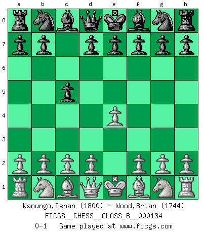 Last move : 0-1 2011 February 11 10:19:13 [Event "FICGS__CHESS__CLASS_B__000134"] [Site "FICGS"] [Date "2011.01.01"] [Round "1"] [White "Kanungo,Ishan"] [Black "Wood,Brian"] [Result "0-1"] [WhiteElo "1800"] [BlackElo "1744"] 1.e4 c5 0-1 This chess game has been lost on time (started : 2011.01.01 19:41:51) Sicilian defense Player Black won this chess game. Follow this game move after move (download)I like to say that Bobby Fischer was the greatest player ever. But what made Fischer a genius was his ability to blend an American freshness and pragmatism with Russian ideas about strategy. (Bruce Pandolfini) Wer der Ansicht ist, daß alle Schachspieler verrückt sind, wird durch Studium des Lebens von Emil Josef Diemer nicht auf andere Gedanken kommen. (Hans Ree) Coloca el contenido de las piezas del Ajedrez en un sombrero, agitalo vigorosamente, arrojalas en un tablero desde una altura de 30 centimetros y así obtendras el estilo de Steinitz. (H. E. Bird) Vous m'avez demandé de vous exposer quel est le fondement de la prière. Je ne fais que préparer les pièces du jeu sur la table... Nous sera-t-il permis d'en adopter les règles et si nous les appliquons scrupuleusement nous ne tarderons pas à faire mat le Roi divin ! Il ne pourra échapper à nos mains. (Sainte Thérèse d'Avila, Chemin de perfection) Statistics can be made to prove anything - even the truth. (Author unknown)