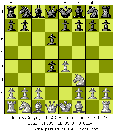 Last move : 0-1 2011 January 3 13:16:6 [Event "FICGS__CHESS__CLASS_B__000134"] [Site "FICGS"] [Date "2011.01.01"] [Round "1"] [White "Osipov,Sergey"] [Black "Jabot,Daniel"] [Result "0-1"] [WhiteElo "1493"] [BlackElo "1877"] 1.e4 c5 2.Nf3 d6 3.d4 cxd4 0-1 Sicilian Player Black won this chess game. Follow this game move after move (download)In Fischer's hands, a slight theoretical advantage is as good a being a Queen ahead. (Isaac Kashdan) Modernes Schach sorgt sich zuviel um Dinge wie Bauernstruktur usw. Vergessen Sie das, Schachmatt beendet das Spiel! (Nigel Short) La captura del Rey enemigo es la finalidad pero no el primer objetivo de la partida. (William Steinitz) Il vaut toujours mieux jouer un plan faux de façon logique que de n'avoir pas de plan du tout. (Victor Kortchnoï) If I had no sense of humor, I would long ago have committed suicide. (Mahatma Gandhi)