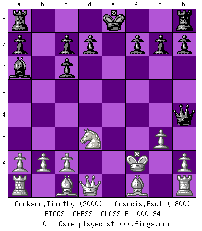 Last move : 1-0 2011 March 13 12:5:11 [Event "FICGS__CHESS__CLASS_B__000134"] [Site "FICGS"] [Date "2011.01.01"] [Round "1"] [White "Cookson,Timothy"] [Black "Arandia,Paul"] [Result "1-0"] [WhiteElo "2000"] [BlackElo "1800"] 1.e4 e5 2.Nf3 Nf6 3.d4 Nc6 4.d5 Nxe4 5.dxc6 Bc5 6.Nxe5 Bxf2+ 7.Ke2 bxc6 8.Nd2 Ba6+ 9.Nd3 Qh4 10.Nxe4 Qxe4 11.Kxf2 Qh4+ 12.g3 1-0 Petrov : Modern (Steinitz) attack Player White won this chess game. Follow this game move after move (download)A great player and a great example for many. His book My 60 Memorable Games had a big impact on me. It is a shame he didn't continue to enrich the world of chess with his unparalleled understanding after 1972. (Jan Timman, about Bobby Fischer's death) Ja, ich habe einmal eine Blitzpartie gespielt, es war in einem Zug, 1929. --im Interview 1989 (Mikhail Moiseyevich Botvinik) El Ajedrez moderno está demasiado preocupado con cosas como la estructura de Peones. Olvidenlo, el Jaque Mate termina la partida. (Nigel Short) Les échecs, c'est l'imagination. (David Bronstein) Internal peace cannot coexist with external war. (Don Groves)
