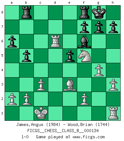 Last move : 1-0 2011 February 4 3:19:8 [Event "FICGS__CHESS__CLASS_B__000134"] [Site "FICGS"] [Date "2011.01.01"] [Round "1"] [White "James,Angus"] [Black "Wood,Brian"] [Result "1-0"] [WhiteElo "1984"] [BlackElo "1744"] 1.e4 c5 2.Nf3 d6 3.d4 cxd4 4.Nxd4 Nf6 5.Nc3 a6 6.h3 e5 7.Nde2 Nc6 8.g4 Be6 9.Bg2 Be7 10.Be3 O-O 11.Nd5 Bxd5 12.exd5 Nb4 13.c3 Nbxd5 14.Bxd5 Nxd5 15.Qxd5 b5 16.Ng3 Bh4 17.Nf5 Be7 18.Qb7 Bf6 19.O-O-O Qb8 20.Qxb8 Raxb8 21.Rxd6 1-0 Sicilian : Najdorf, Adams attack Kingside Castling by player Black (move 10) Queenside Castling by player White (move 19) Player White won this chess game. Follow this game move after move (download)He who takes the Queen's Knight's Pawn will sleep in the streets. (Anonymous) Im Fernschach kannst du während dem Spiel rauchen. (John Christen Knudsen) El Ajedrez no es como la vida... ¡tiene reglas!. (Mark Pasternak) Des combinaisons [dans le jeu d'échecs] pareilles à des mélodies. Je crois entendre pour ainsi dire la musique des coups... (Vladimir Nabokov) Waiting for chance ? Play in casinos. (FICGS proverb)
