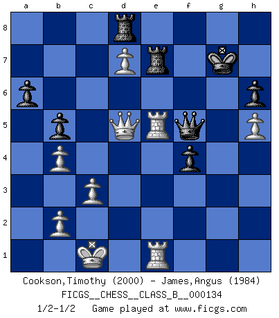 Last move : 1/2-1/2 2011 June 27 17:39:57 [Event "FICGS__CHESS__CLASS_B__000134"] [Site "FICGS"] [Date "2011.01.01"] [Round "1"] [White "Cookson,Timothy"] [Black "James,Angus"] [Result "1/2-1/2"] [WhiteElo "2000"] [BlackElo "1984"] 1.e4 c5 2.Nf3 d6 3.d4 cxd4 4.Nxd4 Nf6 5.Nc3 a6 6.Be3 e5 7.Nb3 Be6 8.f4 exf4 9.Bxf4 Nc6 10.Qe2 Rc8 11.h3 Nb4 12.a3 Nh5 13.axb4 Nxf4 14.Qf3 g5 15.O-O-O Bg7 16.Nd5 O-O 17.Kb1 Be5 18.Na5 Kh8 19.g3 Nxd5 20.exd5 Bd7 21.c3 Rc7 22.Nc4 f5 23.Bd3 Qf6 24.Nxe5 dxe5 25.Bc2 f4 26.Rhe1 Bf5 27.Bxf5 Qxf5+ 28.Kc1 Re8 29.gxf4 gxf4 30.Rd4 Rce7 31.d6 Re6 32.d7 Rd8 33.Qd5 b5 34.h4 h6 35.Rd2 Kh7 36.Rde2 Kg7 37.h5 Re7 38.Rxe5 1/2-1/2 Sicilian : Najdorf, Byrne (English) attack Queenside Castling by player White (move 15) Kingside Castling by player Black (move 16) This chess game ended in a draw. Follow this game move after move (download)Excellence at Chess is one mark of a scheming mind. (Sir Arthur Conan Doyle) Der Partner hat auch seine Existenzberechtigung. (Savielly Grigorievitsch Tartakower) Alguna parte de un error es siempre correcto. (Savielly Tartakover) La vie est comme un jeu d'échecs : nous esquissons un plan, mais celui-ci est tributaire de ce que daignent faire l'adversaire aux échecs et le destin dans la vie. (Arthur Schopenhauer) Locking firmely the window serves nothing, only small thiefs pass through there, the big thiefs enter through the front door. (Luc-Olivier Leclerc)