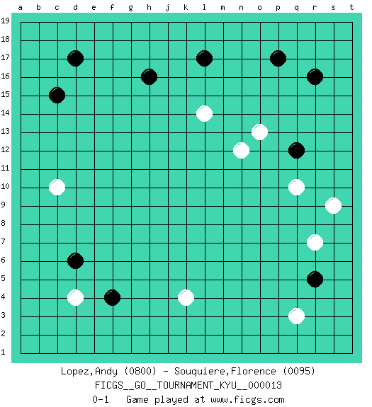 Last move : 0-1 2006 December 14 3:33:22 [Event "FICGS__GO__TOURNAMENT_KYU__000013"] [Site "FICGS"] [Date "2006.12.05"] [Round "1"] [Black "Lopez,Andy"] [White "Souquiere,Florence"] [Result "0-1"] [Rating 1 "0800"] [Rating 2 "0095"] 1.r16 d4 2.d17 q3 3.q12 c10 4.h16 k4 5.l17 r7 6.p17 o13 7.c15 n12 8.f4 q10 9.d6 l14 10.r5 s9 0-1 Here are the names of the openings (joseki) played in the four corners : Corner d4 : d4 f4 Hoshi (Hwajeom, Seongjeom, Xingwei`) 4-4 Point. The star or hoshi (4-4) point, emphasizing influence at the potential expense of territory. Ikken Takagakari (Hankan Nop'dakeolch'im, Yi Gaojia, 1-Space High Approach). White typically responds at 6-4 or 3-10. White 4-10 is played when White finds play on the right side advantageous. White 4-8 or 3-8 may be played when White has support at top. Player White won this Go (weiqi, baduk) game. Follow this game move after move (download)One point in the center is worth ten in the corner. (Anonymous) Luck is what you have left over after you give 100 percent. (Langston Coleman)