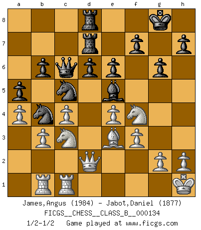 Last move : 1/2-1/2 2011 July 5 16:24:55 [Event "FICGS__CHESS__CLASS_B__000134"] [Site "FICGS"] [Date "2011.01.01"] [Round "1"] [White "James,Angus"] [Black "Jabot,Daniel"] [Result "1/2-1/2"] [WhiteElo "1984"] [BlackElo "1877"] 1.e4 c5 2.Nf3 d6 3.Bb5+ Bd7 4.Bxd7+ Qxd7 5.d4 cxd4 6.Nxd4 Nf6 7.Nc3 g6 8.f3 Bg7 9.O-O O-O 10.Be3 Nc6 11.Qd2 Rac8 12.Rad1 Rfd8 13.a4 a6 14.Nde2 Qc7 15.Nf4 e6 16.Qf2 Re8 17.Bb6 Qe7 18.Qd2 Nd7 19.Bf2 Red8 20.b3 Nc5 21.Be3 Qc7 22.Nce2 b6 23.Kh1 Rd7 24.Rb1 Rcd8 25.c4 a5 26.Nc3 Nb4 27.Na2 Nc6 28.Rfd1 Be5 29.Nc3 Nb4 30.Re1 Qc6 31.Rec1 1/2-1/2 Sicilian : Canal-Sokolsky attack, 3...Bd7 Kingside Castling by player White (move 9) Kingside Castling by player Black (move 9) This chess game ended in a draw. Follow this game move after move (download)Chess holds its master in its own bonds, shackling the mind and brain so that the inner freedom of the very strongest must suffer. (Albert Einstein) Wie kann ich Remis annehmen? Ich weiß ja gar nicht, wie ich stehe! (Fritz Sämisch) Cuando veas una buena jugada, trata de encontrar otra mejor. (Emanuel Lasker) Le jeu d'échecs est comme rejeté hors du temps. (Antoine de Saint-Exupéry) Creativity is allowing yourself to make mistakes. Art is knowing which ones to keep. (Scott Adams)