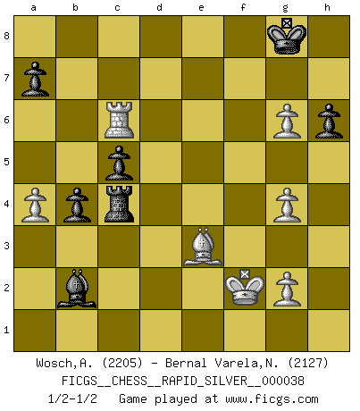 Last move : 1/2-1/2 2011 May 4 14:37:47 [Event "FICGS__CHESS__RAPID_SILVER__000038"] [Site "FICGS"] [Date "2011.01.01"] [Round "1"] [White "Wosch,Arkadiusz"] [Black "Bernal Varela,Nelson"] [Result "1/2-1/2"] [WhiteElo "2205"] [BlackElo "2127"] 1.Nf3 Nf6 2.d4 c5 3.d5 b5 4.c4 Bb7 5.a4 Qa5+ 6.Bd2 b4 7.Qc2 d6 8.e4 Nbd7 9.Be2 g6 10.O-O Bg7 11.Be3 Ng4 12.Bg5 h6 13.Bd2 O-O 14.h3 Nge5 15.Nxe5 Nxe5 16.f4 Nd7 17.Be3 Rae8 18.Bg4 e6 19.dxe6 Nf6 20.Nd2 Nxg4 21.hxg4 Qd8 22.exf7+ Rxf7 23.Rad1 Qc8 24.f5 Qa8 25.fxg6 Rfe7 26.Rf7 Bxe4 27.Nxe4 Qxe4 28.Rxe7 Rxe7 29.Qxe4 Rxe4 30.Kf2 Rxc4 31.Rxd6 Bxb2 32.Rc6 1/2-1/2 Reti Opening Kingside Castling by player White (move 10) Kingside Castling by player Black (move 13) This chess game ended in a draw. Follow this game move after move (download)We must make sure that Chess will not be like a dead language, very interesting, but for a very small group. (Sytze Faber) Ein guter Spieler hat immer Glück. (José Raúl Capablanca) Tu sabes, camarada Pachman, no disfruto el ser un Ministro, preferería jugar al Ajedrez como tu. (Che Guevara) Aux échecs, les retours au sommet sont rares : les dommages psychologiques consécutifs à une défaite sont trop sévères. (Daily Telegraph) As the days dwindle down... to a precious few. (Maxwell Anderson)