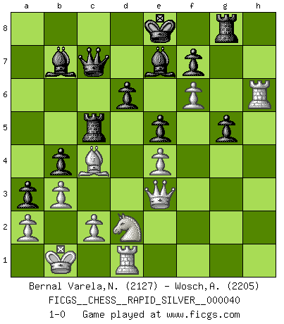 Last move : 1-0 2011 May 1 22:44:3 [Event "FICGS__CHESS__RAPID_SILVER__000040"] [Site "FICGS"] [Date "2011.01.02"] [Round "2"] [White "Bernal Varela,Nelson"] [Black "Wosch,Arkadiusz"] [Result "1-0"] [WhiteElo "2127"] [BlackElo "2205"] 1.e4 c5 2.Nf3 Nc6 3.d4 cxd4 4.Nxd4 Nf6 5.Nc3 d6 6.Bg5 e6 7.Qd2 a6 8.O-O-O Bd7 9.f4 b5 10.Bxf6 gxf6 11.Nf3 b4 12.Ne2 Qb6 13.Kb1 h5 14.Ned4 Nxd4 15.Nxd4 a5 16.Bc4 a4 17.Qd3 Rc8 18.Rhe1 Rg8 19.Re2 a3 20.b3 Rc5 21.f5 e5 22.Nf3 Bc6 23.Nd2 Qb7 24.Qf3 Rh8 25.Re3 Rg8 26.Qe2 Rg4 27.g3 Rg5 28.Rd3 Be7 29.h3 Qc7 30.g4 hxg4 31.hxg4 Bb7 32.Rh3 Rg8 33.Rh6 Qc6 34.Qe3 Qc7 35.g5 fxg5 36.f6 1-0 Sicilian defense Queenside Castling by player White (move 8) Player White won this chess game. Follow this game move after move (download)Nowadays, when you're not a grandmaster at 14, you can forget about it. (Anand Viswanathan) Es war undenkbar für die Behörden, dass ein sowjetischer Großmeister auf diese Art und Weise [Fischer-Taimanov 6:0] verliert, ohne dass es eine politischer Erklärung dafür gäbe. (Mark Taimanov) Realmente no sabemos como el juego fue inventado, aunque hay sospechas. Tan pronto como descubramos a los culpables, se los haremos saber. (Bruce Pandolfini) Lorsque vous vous retrouvez devant une position atroce, ne tendez pas un ultime piège dérisoire avec l'intention d'abandonner si l'adversaire le déjoue ! Faites-vous plutôt un devoir de résister comme si votre vie en dépendait. Jouez le coup qui vous déplairait au centuple si vous étiez dans la peau de votre tortionnaire ! The only sure thing about luck is that it will change. (Wilson Mizner)