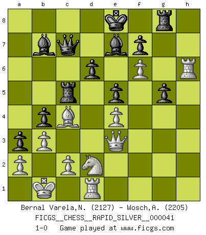 Last move : 1-0 2011 May 1 22:44:11 [Event "FICGS__CHESS__RAPID_SILVER__000041"] [Site "FICGS"] [Date "2011.01.02"] [Round "1"] [White "Bernal Varela,Nelson"] [Black "Wosch,Arkadiusz"] [Result "1-0"] [WhiteElo "2127"] [BlackElo "2205"] 1.e4 c5 2.Nf3 Nc6 3.d4 cxd4 4.Nxd4 Nf6 5.Nc3 d6 6.Bg5 e6 7.Qd2 a6 8.O-O-O Bd7 9.f4 b5 10.Bxf6 gxf6 11.Nf3 b4 12.Ne2 Qb6 13.Kb1 h5 14.Ned4 Nxd4 15.Nxd4 a5 16.Bc4 a4 17.Qd3 Rc8 18.Rhe1 Rg8 19.Re2 a3 20.b3 Rc5 21.f5 e5 22.Nf3 Bc6 23.Nd2 Qb7 24.Qf3 Rh8 25.Re3 Rg8 26.Qe2 Rg4 27.g3 Rg5 28.Rd3 Be7 29.h3 Qc7 30.g4 hxg4 31.hxg4 Bb7 32.Rh3 Rg8 33.Rh6 Qc6 34.Qe3 Qc7 35.g5 fxg5 36.f6 1-0 Sicilian defense Queenside Castling by player White (move 8) Player White won this chess game. Follow this game move after move (download)It's just you and your opponent at the board and you're trying to prove something. (Bobby Fischer) Das Spiel gibt uns die Genugtuung, die das Leben uns versagt. (Emanuel Lasker) Te sientas frente a un tablero y repentinamente tu corazón brinca. Tu mano tiembla al tomar una pieza y moverla. Pero lo que el Ajedrez te enseña es que tu debes permanecer ahí con calma y pensar de que si realmente es una buena idea o de que si hay otras ideas mejores. (Stanley Kubrick) Un footballeur joue avec ses pieds, parfois avec sa tête. Un joueur d'échecs ne joue qu'avec sa tête. Et quand il ne joue plus, il meurt. (Jacob Murray) Perhaps the current trend of many chess professionals taking up the more lucrative pastime of poker is not a wholly negative one. It may not be too late for humans to relearn how to take risks in order to innovate and thereby maintain the advanced lifestyles we enjoy. And if it takes a poker-playing supercomputer to remind us that we can't enjoy the rewards without taking the risks, so be it. (The Chess Master and the Computer, by Garry Kasparov - 2010)