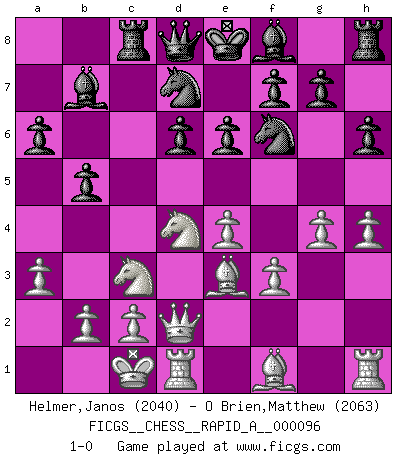 Last move : 1-0 2011 March 27 0:52:8 [Event "FICGS__CHESS__RAPID_A__000096"] [Site "FICGS"] [Date "2011.01.02"] [Round "1"] [White "Helmer,Janos"] [Black "O Brien,Matthew"] [Result "1-0"] [WhiteElo "2040"] [BlackElo "2063"] 1.e4 c5 2.Nf3 d6 3.d4 cxd4 4.Nxd4 Nf6 5.Nc3 a6 6.Be3 e6 7.f3 b5 8.Qd2 Nbd7 9.g4 h6 10.O-O-O Bb7 11.a3 Rc8 12.h4 1-0 This chess game has been lost on time (started : 2011.01.02 10:3:42) Sicilian : Najdorf, Byrne (English) attack Queenside Castling by player White (move 10) Player White won this chess game. Follow this game move after move (download)Pawn endings are to Chess what putting is to golf. (Cecil Purdy) Zeige mir drei Eröffnungsvarianten und ich beweise dir, dass zwei davon inkorrekt sind. (Emanuel Lasker) Debió haber existido una vez en que los hombres eran semidióses, de otra manera no hubiesen podido inventar el Ajedrez. (Gustav Schenk) Des combinaisons [dans le jeu d'échecs] pareilles à des mélodies. Je crois entendre pour ainsi dire la musique des coups... (Vladimir Nabokov) It's not enough to succeed. Others must fail. (Gore Vidal)