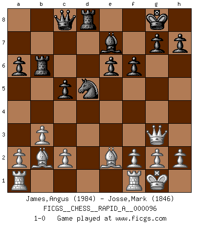 Last move : 1-0 2011 March 24 12:39:35 [Event "FICGS__CHESS__RAPID_A__000096"] [Site "FICGS"] [Date "2011.01.02"] [Round "1"] [White "James,Angus"] [Black "Josse,Mark"] [Result "1-0"] [WhiteElo "1984"] [BlackElo "1846"] 1.e4 c5 2.Nf3 e6 3.d4 cxd4 4.Nxd4 Nc6 5.Nc3 Qc7 6.Be2 a6 7.Be3 Nf6 8.O-O Bb4 9.Na4 Be7 10.Nxc6 bxc6 11.Nb6 Rb8 12.Nxc8 Qxc8 13.Bd4 c5 14.Be5 Rb6 15.Qd3 d6 16.Bc3 O-O 17.b3 d5 18.exd5 Nxd5 19.Be5 Rd8 20.Qg3 f6 21.Bb2 1-0 This chess game has been lost on time (started : 2011.01.02 10:3:42) Sicilian : Taimanov (Bastrikov) variation Kingside Castling by player White (move 8) Kingside Castling by player Black (move 16) Player White won this chess game. Follow this game move after move (download)Fischer sacrificed virtually everything most of us weakies (to use his term) value, respect, and cherish, for the sake of an artful, often beautiful board game, for the ambivalent privilege of being its greatest master. (Paul Kollar) Der Bart als Geschlechtszeichen mitten im Gesicht ist obszön. Daher gefällt er den Weibern. [Zugegeben, kein Schachzitat, aber unglaublich originell] (Arthur Schopenhauer) El juego de Damas es para vagabundos. (Paul Morphy) J'apprécie les joueurs d'est-indienne, c'est grâce à eux que je nourris ma famille depuis tant d'années. (Petrosian) Man is reluctant to give credit for intelligence to anyone, except his enemies. (Albert Einstein)