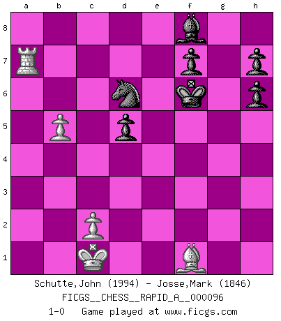 Last move : 1-0 2011 March 29 1:52:36 [Event "FICGS__CHESS__RAPID_A__000096"] [Site "FICGS"] [Date "2011.01.02"] [Round "1"] [White "Schutte,John"] [Black "Josse,Mark"] [Result "1-0"] [WhiteElo "1994"] [BlackElo "1846"] 1.e4 c5 2.Nf3 d6 3.d4 cxd4 4.Nxd4 Nf6 5.Nc3 a6 6.h3 e6 7.g4 Be7 8.g5 Nfd7 9.Be3 Nc6 10.h4 Qc7 11.h5 Nc5 12.f3 Bd7 13.a3 b5 14.b4 Nb7 15.Nxc6 Bxc6 16.a4 bxa4 17.Qd4 Rg8 18.h6 Bf8 19.Nxa4 d5 20.exd5 Bxd5 21.Nb6 Rd8 22.Nxd5 Rxd5 23.Qc4 Qg3+ 24.Ke2 gxh6 25.Bf4 Re5+ 26.Bxe5 Qxe5+ 27.Kd2 Nd6 28.Qc6+ Ke7 29.Rxa6 Qd4+ 30.Kc1 Qf4+ 31.Kd1 Rxg5 32.Rh4 Qg3 33.Rd4 Rd5 34.Rxd5 Qxf3+ 35.Kc1 Qxd5 36.Ra7+ Kf6 37.Qxd5 exd5 38.b5 1-0 This chess game has been lost on time (started : 2011.01.02 10:3:42) Sicilian : Najdorf, Adams attack Player White won this chess game. Follow this game move after move (download)What is the object of playing a gambit opening?... To acquire a reputation of being a dashing player at the cost of losing a game. (Siegbert Tarrasch) Irgendwie scheint mir sonntags früh um 9 Uhr der Killerinstinkt verloren gegangen zu sein. (Alexej Shirov) Cuando tengo las piezas blancas, yo gano porque soy blanco; Cuando tengo las piezas negras, yo gano porque soy Bogolyubov. (Bogolyubov) Tout change constamment, y compris dans le monde des Echecs. (Botvinnik) Pretend inferiority and encourage his arrogance. (Sun Tzu)