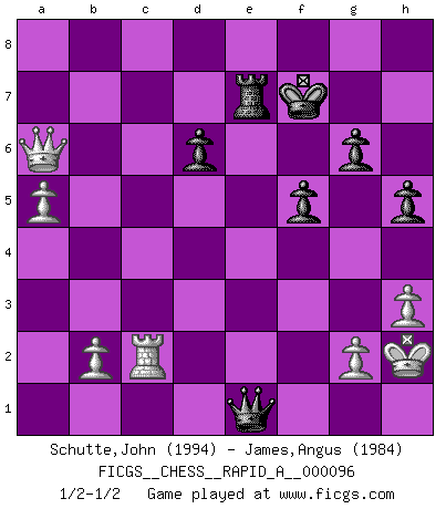 Last move : 1/2-1/2 2011 March 16 13:10:2 [Event "FICGS__CHESS__RAPID_A__000096"] [Site "FICGS"] [Date "2011.01.02"] [Round "1"] [White "Schutte,John"] [Black "James,Angus"] [Result "1/2-1/2"] [WhiteElo "1994"] [BlackElo "1984"] 1.e4 c5 2.Nf3 d6 3.d4 cxd4 4.Nxd4 Nf6 5.Nc3 a6 6.h3 e5 7.Nde2 h5 8.Be3 Nbd7 9.Ng3 b5 10.Be2 g6 11.a4 b4 12.Nd5 Bb7 13.Bg5 Bxd5 14.exd5 Qa5 15.Nf1 Ne4 16.Bc1 f5 17.Nd2 Nxd2 18.Bxd2 Bh6 19.Bxh6 Rxh6 20.Rc1 Kf7 21.O-O Rc8 22.Bd3 Nc5 23.Qd2 R6h8 24.Rfd1 Nxd3 25.cxd3 Rhe8 26.Re1 Qxd5 27.Qxb4 Rxc1 28.Rxc1 Qxd3 29.Qb6 e4 30.Rc3 Qd1+ 31.Kh2 Qd5 32.Qxa6 Re7 33.a5 Qd4 34.Rc2 Qe5+ 35.Kg1 e3 36.fxe3 Qxe3+ 37.Kh1 Qe1+ 38.Kh2 Qe5+ 39.Kh1 Qe1+ 40.Kh2 1/2-1/2 Sicilian : Najdorf, Adams attack Kingside Castling by player White (move 21) This chess game ended in a draw. Follow this game move after move (download)Modern Chess is too much concerned with things like Pawn structure. Forget it, Checkmate ends the game. (Nigel Short) Wenn Schach ein enormer Dschungel ist, der seine Myriaden von Geheimnissen nicht preisgeben will, dann sind Computer die Kettensägen einer gewaltigen ökologisch unsensiblen Nutzholzfirma. (Nigel Short) El Ajedrez era la lengua materna de Capablanca. (Reti) Donnez-moi un Cavalier en 6e et je gagnerais toutes mes parties. (Steinitz) Hold em is to stud what chess is to checkers. (Johnny Moss)