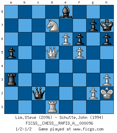 Last move : 1/2-1/2 2011 February 18 5:48:28 [Event "FICGS__CHESS__RAPID_A__000096"] [Site "FICGS"] [Date "2011.01.02"] [Round "1"] [White "Lim,Steve"] [Black "Schutte,John"] [Result "1/2-1/2"] [WhiteElo "2096"] [BlackElo "1994"] 1.d4 d5 2.c4 c6 3.Nc3 Nf6 4.Nf3 e6 5.e3 Nbd7 6.Qc2 Bd6 7.Bd3 dxc4 8.Bxc4 O-O 9.O-O b5 10.Be2 a6 11.Ng5 Bb7 12.e4 e5 13.dxe5 Bxe5 14.f4 Bd4+ 15.Kh1 h6 16.Nf3 Bxc3 17.bxc3 c5 18.e5 Nd5 19.c4 bxc4 20.Qxc4 Qe7 21.a3 Rab8 22.Qc2 Rfe8 23.Re1 N7b6 24.Bf1 c4 25.Qf2 Qc7 26.f5 f6 27.e6 Nc8 28.Nh4 c3 29.Qf3 Kh7 30.Qh5 Nd6 31.Bd3 Bc6 32.Qg4 a5 33.Rb1 Rxb1 34.Bxb1 Rc8 35.Bc2 Be8 36.Rd1 Qc5 37.Qf3 Ne7 38.Ng6 Nc4 39.Nf8+ Kh8 40.Nd7 Qc6 41.Qf4 Nd5 42.Qd4 Nd2 43.Bxd2 cxd2 44.Qxd2 Ne3 45.Qxe3 Qxc2 46.Qf3 Rc3 47.Qd5 Kh7 48.h3 Rxa3 49.Kh2 1/2-1/2 QGD Slav defense Kingside Castling by player Black (move 8) Kingside Castling by player White (move 9) This chess game ended in a draw. Follow this game move after move (download)Chess is not like life... it has rules ! (Mark Pasternak) Man wirke der falschen Auffassung entgegen, als ob jeder Zug Unmittelbares zu leisten habe; auch Werte- und Ruhezüge haben ihre Existenzberechtigung. (Aaron Nimzowitsch) En el Ajedrez, cuando menos, el valiente hereda la tierra. (Edmar Mednis) Un footballeur joue avec ses pieds, parfois avec sa tête. Un joueur d'échecs ne joue qu'avec sa tête. Et quand il ne joue plus, il meurt. (Jacob Murray) The intuitive mind is a sacred gift; the rational mind is a faithful servant. We have created a society that honors the servant but has forgotten the gift. (Albert Einstein)