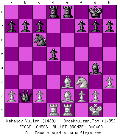 Last move : 1-0 2011 January 2 10:51:11 [Event "FICGS__CHESS__BULLET_BRONZE__000460"] [Site "FICGS"] [Date "2011.01.02"] [Round "1"] [White "Kehayov,Yulian"] [Black "Broekhuizen,Tom"] [Result "1-0"] [WhiteElo "1439"] [BlackElo "1495"] 1.e4 e5 2.d4 exd4 3.Qxd4 Nc6 4.Qd1 Nf6 5.Nc3 Bb4 6.Bd2 O-O 7.Nf3 Re8 8.Be2 Bxc3 9.Bxc3 Nxe4 10.Bd2 Qf6 11.Bd3 Nc3 12.Be3 Nxd1 13.Rxd1 d5 14.O-O Bg4 15.Be2 Rad8 16.Rfe1 Qxb2 17.h3 1-0 Centre game Kingside Castling by player Black (move 6) Kingside Castling by player White (move 14) Player White won this chess game. Follow this game move after move (download)Fischer is completely natural. He plays no roles. He's like a child. Very, very simple. (Zita Rajcsanyi) Die Leute spielen gegen mich seit 15 Jahren unter Ihren Möglichkeiten. (Robert James Fischer) Creo que una cierta cantidad de temperamento es esperada de los genios del Ajedrez. (Ron Gross) Nous sommes les pions de la mystérieuse partie d'Echecs jouée par Dieu. Il nous déplace, nous arrête, nous pousse encore, puis nous lance un à un dans la boîte du Néant. Epitaphe sur la tombe de David Janowsky (1868-1927). Computer Science is no more about computers than astronomy is about telescopes. (Edsger W. Dijkstra)