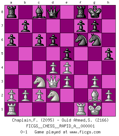 Last move : 0-1 2006 July 13 1:31:24 [Event "FICGS__CHESS__RAPID_A__000001"] [Site "FICGS"] [Date "2006.04.30"] [Round "1"] [White "Chaplain,Fabrice"] [Black "Ould Ahmed,Samy"] [Result "0-1"] [WhiteElo "2095"] [BlackElo "2166"] 1.e4 e5 2.Nf3 Nc6 3.Nc3 Nf6 4.g3 Bc5 5.Bg2 d6 6.d3 a6 7.O-O O-O 8.Be3 Bxe3 9.fxe3 Ne7 10.d4 Ng6 11.Qd3 c6 12.Nd2 h5 0-1 This chess game has been lost on time (started : 2006.04.30 20:27:54) Four knights game Kingside Castling by player White (move 7) Kingside Castling by player Black (move 7) Player Black won this chess game. Follow this game move after move (download)Good positions don't win games, good moves do. (Gerald Abrahams) Modernes Schach erfordert enorme Anspannung. Es ist für einen normalen Menschen unmöglich das auszuhalten. (Viktor Kortschnoi) Me dio la sensación de como si yo estuviera jugando en contra del mismo Ajedrez. - al estar jugando en contra de Robert Fischer (Walter Shipman) Je crois qu'il existe des manières très spécifiques de jouer efficacement contre une machine. Evidemment, nous n'avons aucune chance en technique pure, parce que l'ordinateur calcule de manière parfaite. Mais lorsque nous faisons appel à notre cerveau, en utilisant l'intuition et la compréhension, alors nous restons beaucoup plus forts. (Anatoli Karpov) Question: Is 'This statement is paradoxical' a paradoxical statement ? Or is it a meta-paradox ? (Normajean Yates)