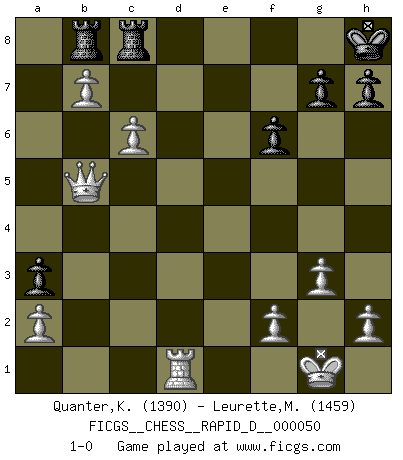 Last move : 1-0 2011 January 16 10:29:25 [Event "FICGS__CHESS__RAPID_D__000050"] [Site "FICGS"] [Date "2011.01.02"] [Round "1"] [White "Quanter,Kirsty"] [Black "Leurette,Marc-Antoine"] [Result "1-0"] [WhiteElo "1390"] [BlackElo "1459"] 1.e4 e5 2.Nf3 Nc6 3.Bb5 Bc5 4.O-O Nf6 5.c3 O-O 6.d4 Bb6 7.Nxe5 Nxe4 8.Re1 Nf6 9.Na3 a6 10.Ba4 Nxe5 11.dxe5 Ne8 12.Bb3 d6 13.Bf4 a5 14.Nb5 Bc5 15.Qd3 a4 16.Bc2 Qh4 17.g3 Qh3 18.exd6 cxd6 19.Nxd6 Nxd6 20.Bxd6 Bxd6 21.Qxd6 Bg4 22.Qf4 a3 23.b4 Bd7 24.Be4 Bc6 25.Bxc6 bxc6 26.Rad1 Rac8 27.Qf3 f6 28.c4 c5 29.b5 Ra8 30.Qd5+ Kh8 31.b6 Rab8 32.Qxc5 Qc8 33.Qb5 Rb7 34.c5 R8f7 35.Re8+ Rf8 36.Rxc8 Rxc8 37.c6 R7b8 38.b7 1-0 Ruy Lopez : Classical (Cordel) defense Kingside Castling by player White (move 4) Kingside Castling by player Black (move 5) Player White won this chess game. Follow this game move after move (download)Chess is the gymnasium of the mind. (Blaise Pascal) Vom Schach wurde gesagt das Leben sei dafür nicht lange genug. Aber das ist der Fehler des Lebens, nicht des Schach'. (Irving Chernev) No es una movida, aún la mejor movida que tu debas buscar, sino un plan comprensible. (Eugene Znosko-Borovsky) Le moment que je préfère le plus dans une rencontre, c'est celui où je sens que la personnalité de l'adversaire se brise. (Robert Fischer) Now you put water in a cup, it becomes the cup; You put water into a bottle it becomes the bottle; You put it in a teapot it becomes the teapot. Water can flow or it can crash. Be water, my friend. (Bruce Lee)