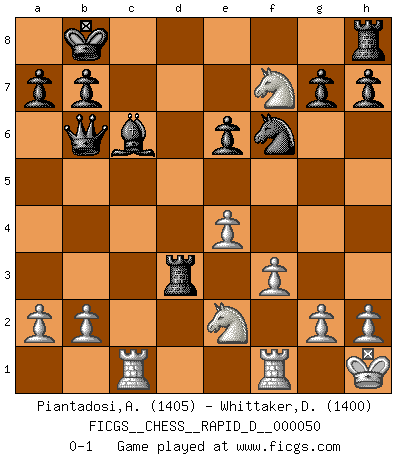 Last move : 0-1 2011 January 25 21:8:31 [Event "FICGS__CHESS__RAPID_D__000050"] [Site "FICGS"] [Date "2011.01.02"] [Round "1"] [White "Piantadosi,Angelo"] [Black "Whittaker,Deon"] [Result "0-1"] [WhiteElo "1405"] [BlackElo "1400"] 1.d4 Nf6 2.c4 d5 3.cxd5 Qxd5 4.Nc3 Qa5 5.Bd2 Bd7 6.e4 Qb4 7.Bd3 Qxd4 8.Be3 Qe5 9.f3 Nc6 10.Nge2 O-O-O 11.O-O e6 12.Rc1 Bd6 13.Bf4 Qh5 14.Bxd6 cxd6 15.Nb5 Kb8 16.Nxd6 Na5 17.Qd2 Bc6 18.Qxa5 Qxa5 19.Nxf7 Qb6+ 20.Kh1 Rxd3 0-1 Queen's pawn game Queenside Castling by player Black (move 10) Kingside Castling by player White (move 11) Player Black won this chess game. Follow this game move after move (download)When I have White, I win because I am white; When I have Black, I win because I am Bogolyubov. (Bogolyubov) Die Fehler sind da, Sie warten nur darauf gemacht zu werden. (Savielly Grigorievitsch Tartakower) Hay dos clases de hombres: aquellos que se conforman en dejarse llevar por las circunstancias y que juegan barajas y aquellos decididos a controlar las circunstancias y que juegan al Ajedrez. (Mortimer Collins) Un journaliste : 'Vous préférez avoir une dame de plus sur l'échiquier ou au lit ?' Boris Spassky : 'Ca dépend de la position.' If only people were all showed a certain minimum level of niceness; if only people didn't retract verbal draw offers (without draw box ticked) on ficgs; if only people didn't kill; if only people didn't run concentration / extermination camps, if only people didn't drop nuclear bombs on Hiroshima and Nagasaki, and so on - it would be a much more beautiful world. But sadly, things are not so... (Normajean Yates)