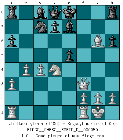 Last move : 1-0 2011 January 21 19:8:32 [Event "FICGS__CHESS__RAPID_D__000050"] [Site "FICGS"] [Date "2011.01.02"] [Round "1"] [White "Whittaker,Deon"] [Black "Segur,Laurine"] [Result "1-0"] [WhiteElo "1400"] [BlackElo "1400"] 1.e4 c6 2.Nf3 e6 3.d4 b5 4.Bg5 Ne7 5.Bxe7 Bxe7 6.a3 Na6 7.Bd3 c5 8.O-O g6 9.Nc3 Nc7 10.b4 cxd4 11.Nxd4 f6 12.Ncxb5 e5 13.Qf3 exd4 14.Nxd4 a6 15.c4 h6 16.e5 fxe5 17.Bxg6+ 1-0 Caro-Kann defense Kingside Castling by player White (move 8) Player White won this chess game. Follow this game move after move (download)The way he plays Chess demonstrates a man's whole nature. (Stanley Ellin) Es gibt keine einzige Frau, der ich nicht einen Springer vorgeben könnte und trotzdem gewänne. (Robert James Fischer) Cuando le juegas a Fischer, no es una cuestion de si vas a ganar o perder. Es una cuestion de si vas a sobrevivir. (Boris Spassky) Même un GMI sait rarement calculer sur plus de cinq coups une attaque à sacrifices. (Rudolf Spielmann) No, no, you're not thinking; you're just being logical. (Niels Bohr)