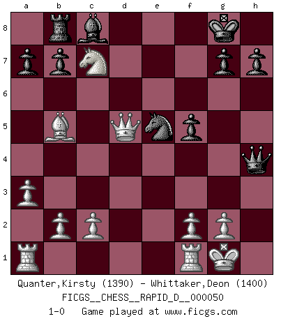 Last move : 1-0 2011 January 17 0:43:2 [Event "FICGS__CHESS__RAPID_D__000050"] [Site "FICGS"] [Date "2011.01.02"] [Round "1"] [White "Quanter,Kirsty"] [Black "Whittaker,Deon"] [Result "1-0"] [WhiteElo "1390"] [BlackElo "1400"] 1.e4 e6 2.d4 d5 3.Nc3 Nf6 4.e5 Nfd7 5.Nf3 c5 6.Bb5 Be7 7.O-O O-O 8.h4 Bxh4 9.dxc5 Nxc5 10.Nxh4 Qxh4 11.Be3 Nbd7 12.a3 f6 13.Nxd5 Nxe5 14.Bxc5 f5 15.Bxf8 Ng4 16.Bd6 e5 17.Bxe5 Nxe5 18.Nc7 Rb8 19.Qd5+ 1-0 French : Steinitz variation Kingside Castling by player White (move 7) Kingside Castling by player Black (move 7) Player White won this chess game. Follow this game move after move (download)The game of Chess is not merely an idle amusement; several very valuable qualities of the mind are to be acquired and strengthened by it, so as to become habits ready on all occasions; for life is a kind of Chess. (Benjamin Franklin) Ich habe Kasparov in Rente geschickt. (Veselin Topalov) El Ajedrez por encima de todo... ¡es una pelea!. (Emanuel Lasker) Je ne crois pas en la psychologie, je crois aux bons coups. (Robert Fischer) All battles are fought by scared men who'd rather be someplace else. (John Wayne in the movie In harm's way)