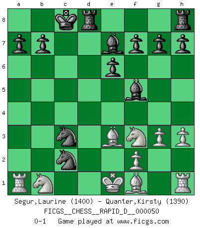 Last move : 0-1 2011 January 13 15:7:38 [Event "FICGS__CHESS__RAPID_D__000050"] [Site "FICGS"] [Date "2011.01.02"] [Round "1"] [White "Segur,Laurine"] [Black "Quanter,Kirsty"] [Result "0-1"] [WhiteElo "1400"] [BlackElo "1390"] 1.e4 c5 2.d3 Nc6 3.g3 d5 4.c3 Nf6 5.Nf3 dxe4 6.dxe4 Qxd1+ 7.Kxd1 Nxe4 8.Be3 Bf5 9.Nbd2 O-O-O 10.Ke1 e6 11.h3 Be7 12.b4 Nxc3 13.a3 cxb4 14.axb4 Nxb4 15.Nb1 Nc2+ 0-1 Sicilian defense Queenside Castling by player Black (move 9) Player Black won this chess game. Follow this game move after move (download)When in doubt... play Chess ! (Tevis) Ein Schachspiel besteht aus drei Phasen: Die erste, wenn du hofftst den Vorteil zu haben, die zweite, wenn du glaubst einen Vorteil zu haben, und die dritte.... wenn du weißt Du wirst verlieren. (Savielly Grigorievitsch Tartakower) Solo puedes ser bueno en el Ajedrez si amas al juego. (Bobby Fischer) La vérité est comme le meilleur coup aux échecs : elle existe, mais il faut la chercher. (Arturo Perez-Reverte) Life is pain my dear and anyone who says otherwise is selling something. (Princess Bride)