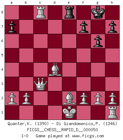 Last move : 1-0 2011 January 25 17:17:50 [Event "FICGS__CHESS__RAPID_D__000050"] [Site "FICGS"] [Date "2011.01.02"] [Round "1"] [White "Quanter,Kirsty"] [Black "Di Giandomenico,Pierino"] [Result "1-0"] [WhiteElo "1390"] [BlackElo "1346"] 1.e4 e5 2.c4 c5 3.Nc3 Nf6 4.Nd5 Nc6 5.d3 Nxd5 6.cxd5 Nd4 7.Nf3 Qa5+ 8.Bd2 Qa4 9.Qxa4 Be7 10.Nxd4 exd4 11.Bf4 O-O 12.d6 Bxd6 13.Bxd6 Re8 14.Bxc5 b6 15.Bxb6 Bb7 16.Bxd4 Bc6 17.Qa3 g6 18.Be2 d5 19.Rc1 dxe4 20.Rxc6 exd3 21.Qxd3 Rad8 22.Qc3 Rc8 23.Rxc8 1-0 King's pawn game Kingside Castling by player Black (move 11) Player White won this chess game. Follow this game move after move (download)By this measure (on the gap between Fischer & his contemporaries), I consider him the greatest world champion. (Garry Kasparov) Mein Name ist Rustam Kamsky. Sie haben meinen Sohn belästigt. Bereiten Sie sich aufs Sterben vor. (Rustam Kamsky) Nunca antes ha habido un jugador de Ajedrez con tal conocimiento a fondo de las complejidades del juego y una inmensa voluntad absolutamente indomable de ganar. Yo pienso que Fischer es el jugador mas grande que jamás haya existido. (Lisa Lane) On a dit que l'homme se distingue de l'animal par le fait qu'il achète plus de livres qu'il ne peut en lire. Je voudrais suggérer qu'inclure à la liste des livres quelques livres d'échecs rendrait la distinction manifeste. (Edward Lasker) Children in the dark cause accidents, accidents in the dark cause children. (Unknown)