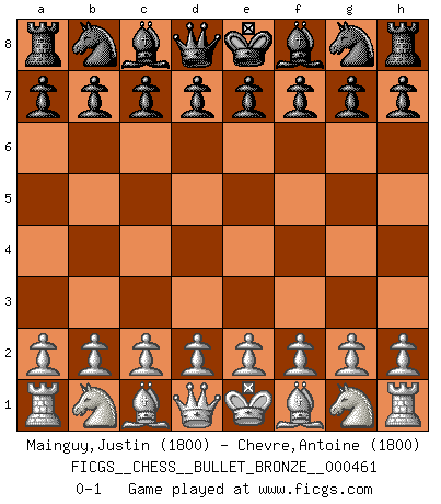 Last move : 0-1 2011 January 2 18:55:11 [Event "FICGS__CHESS__BULLET_BRONZE__000461"] [Site "FICGS"] [Date "2011.01.02"] [Round "1"] [White "Mainguy,Justin"] [Black "Chevre,Antoine"] [Result "0-1"] [WhiteElo "1800"] [BlackElo "1800"] 0-1 This chess game has been lost on time (started : 2011.01.02 18:33:27) Player Black won this chess game. Follow this game move after move (download)When the Chess game is over, the Pawn and the King go back to the same box. (Irish saying) Frage: Wie viele Autos haben Sie schon zerstört? - Antwort: Nur zwei. (Loek van Wely) Los problemas de Ajedrez exigen del compositor las mismas virtudes que caracterizan todo el arte de valor: originalidad, invención, concisión, armonía, complejidad e insinceridad explendida. (Vladimir Nabokov) Plusieurs personnes se sont demandées comment Tal faisait pour gagner... En fait, c'est très simple ! Il met ses pièces au centre de l'échiquier et les sacrifie quelque part ! (David Bronstein) Live, lose, and learn, by observing your opponent how to win. (Amber Steenbock)