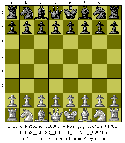 Last move : 0-1 2011 January 2 23:8:7 [Event "FICGS__CHESS__BULLET_BRONZE__000466"] [Site "FICGS"] [Date "2011.01.02"] [Round "1"] [White "Chevre,Antoine"] [Black "Mainguy,Justin"] [Result "0-1"] [WhiteElo "1800"] [BlackElo "1761"] 0-1 This chess game has been lost on time (started : 2011.01.02 19:27:5) Player Black won this chess game. Follow this game move after move (download)Chess teaches you to control the initial excitement you feel when you see something that looks good and it trains you to think objectively when you're in trouble. (Stanley Kubrick) Weshalb minderdergeübte Spieler mit g2-g4 beginnen? Die betreffenden sind unschlüssig, ob sie nun rechts (h4) oder links (f4) beginnen sollen, und in ihrer Ratlosigkeit entschliessen sie sich nach guter Bürgerart dazu, den goldenen Mittelweg zu wählen. (Aaron Nimzowitsch) No puedes jugar al Ajedrez si eres de corazón noble. (Proverbio Francés) Roi des jeux et jeu des rois, les échecs portent en eux un sentiment d'infini. Ils donnent à celui qui s'est efforcé d'en approfondir les arcanes l'impression de n'être pas à la mesure de l'homme; en fait, ils constituent un résumé de l'univers, un microcosme, et figurent cette grande échelle qui, dans les plans de la lumière descend jusqu'à la matière, qui des abîmes insondables remonte jusqu'en l'infini de Dieu. (Pyrame) I've never seen so many men wasted so badly. (Blondie in The Good, The Bad and The Ugly)