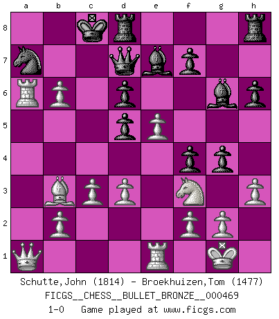 Last move : 1-0 2011 January 2 21:59:15 [Event "FICGS__CHESS__BULLET_BRONZE__000469"] [Site "FICGS"] [Date "2011.01.02"] [Round "1"] [White "Schutte,John"] [Black "Broekhuizen,Tom"] [Result "1-0"] [WhiteElo "1814"] [BlackElo "1477"] 1.e4 e5 2.Nf3 Nc6 3.Bb5 a6 4.Ba4 Nf6 5.O-O Be7 6.Re1 b5 7.Bb3 d6 8.c3 Bg4 9.h3 Bh5 10.d3 Qd7 11.Nbd2 h6 12.Nf1 g5 13.Ne3 Bg6 14.Bd2 Nh5 15.Nd5 Nf4 16.Bxf4 exf4 17.e5 O-O-O 18.a4 Na7 19.axb5 g4 20.b6 c6 21.Rxa6 cxd5 22.Qa1 1-0 Ruy Lopez : Closed Kingside Castling by player White (move 5) Queenside Castling by player Black (move 17) Player White won this chess game. Follow this game move after move (download)Life is like a game of Chess, changing with each move. (Chinese proverb) Ein Springer auf f6 gegen die eigene Rochadestellung ist schlimmer als ein rostiger Nagel im Knie. (Efim Bogoljubov) Un Peón pasado es un criminal, quién debe ser mantenido bajo candado y llave. Leves medidas, tales como vigilancia policiaca, no son suficientes. (Aaron Nimzovich) Il s'avisa de me proposer d'apprendre les échecs qu'il jouait un peu... me voilà forcené des échecs. J'achète un échiquier, je m'enferme dans ma chambre, j'y passe des jours et des nuits à vouloir apprendre par cur toutes les parties. (Jean-Jacques Rousseau, Confessions) The meaning of life is that it is to be lived, and it is not to be traded and conceptualized and squeezed into a pattern of systems. (Bruce Lee)