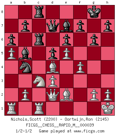 Last move : 1/2-1/2 2011 January 15 15:18:1 [Event "FICGS__CHESS__RAPID_M__000039"] [Site "FICGS"] [Date "2011.01.03"] [Round "1"] [White "Nichols,Scott"] [Black "Oortwijn,Ron"] [Result "1/2-1/2"] [WhiteElo "2200"] [BlackElo "2145"] 1.e4 c5 2.Nf3 d6 3.d4 cxd4 4.Nxd4 Nf6 5.Nc3 a6 6.Be2 e6 7.O-O Be7 8.f4 O-O 9.Be3 Nc6 10.a4 Qc7 11.Kh1 Re8 12.Bf3 Bf8 13.Nb3 d5 14.e5 Nd7 15.a5 Rb8 16.Bh5 Nb4 17.Ba7 Ra8 18.Bf2 g6 19.Bf3 Nc5 20.Nc1 Bd7 21.Nd3 Ncxd3 22.cxd3 Bb5 23.Bb6 Qd7 24.Be2 Rec8 25.Qd2 Rc6 26.Rfc1 Rac8 27.Bd4 Be7 1/2-1/2 Sicilian : Najdorf, Opovcensky variation Kingside Castling by player White (move 7) Kingside Castling by player Black (move 8) This chess game ended in a draw. Follow this game move after move (download)You must take your opponent into a deep dark forest where 2+2=5, and the path leading out is only wide enough for one. (Mikhail Tal) Das Schach hält seine Meister in eigenen Banden, Fesseln; auf vielerlei Weise formt es ihren Geist, so dass die innere Freiheit selbst des Stärksten beeinflusst wird. (Albert Einstein) Aquel que ve no otra dirección en el juego que la de dar Jaque Mate a su oponente, nunca será un buen jugador de Ajedrez. (Euwe) Le pion, dans sa simplicité, marche droit devant lui, mais lorsqu'il prend, il le fait obliquement? Ainsi l'homme, tant qu'il reste pauvre, marche dans la droiture et vit honnêtement, mais lorsqu'il recherche les honneurs, il flatte, se parjure et, par les voies obliques, cherche une position supérieure sur l'échiquier du monde. (Jean de Galles) We're missing something. (Gregory House, House M.D.)