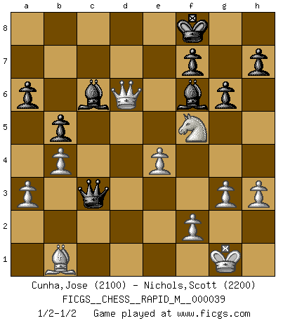 Last move : 1/2-1/2 2011 January 10 2:3:32 [Event "FICGS__CHESS__RAPID_M__000039"] [Site "FICGS"] [Date "2011.01.03"] [Round "1"] [White "Cunha,Jose"] [Black "Nichols,Scott"] [Result "1/2-1/2"] [WhiteElo "2100"] [BlackElo "2200"] 1.e4 e5 2.Nf3 Nc6 3.Bb5 a6 4.Ba4 Nf6 5.O-O Be7 6.Re1 b5 7.Bb3 d6 8.c3 O-O 9.h3 Na5 10.Bc2 c5 11.d4 Qc7 12.Nbd2 cxd4 13.cxd4 Rd8 14.b3 Bb7 15.Bb2 Nc6 16.a3 exd4 17.Nxd4 Nxd4 18.Bxd4 Rac8 19.Rc1 Qb8 20.b4 Nd7 21.Nf1 Bg5 22.Ne3 Ne5 23.Qe2 Re8 24.Bb1 Rxc1 25.Rxc1 Qa8 26.Bxe5 Rxe5 27.Rc7 Re7 28.Rxe7 Bxe7 29.Qf3 Bf6 30.Nf5 Qc8 31.Qd1 Qc3 32.Nxd6 Bc6 33.g3 Kf8 34.Nf5 g6 35.Qd6+ 1/2-1/2 Ruy Lopez : Closed Kingside Castling by player White (move 5) Kingside Castling by player Black (move 8) This chess game ended in a draw. Follow this game move after move (download)Bobby Fischer is the greatest Chess genius of all time ! (Alexander Kotov) Charakterschwächen offenbaren sich normalerweise während einer Schachpartie. (Garry Kasparov) Cuando tu casa esta en llamas, no puedes ser molestado por tus vecinos. O, como decinos en Ajedrez, si tu Rey esta bajo ataque, no te preocupa perder un Peón del lado de la Reina. (Gary Kasparov) Ce qui caractérise les parties de combat, c'est que si le défenseur a constamment de difficiles problèmes à résoudre, l'attaquant doit chercher sans relâche de nouvelles possibilités d'attaque. (Koblentz) It's not enough to succeed. Others must fail. (Gore Vidal)