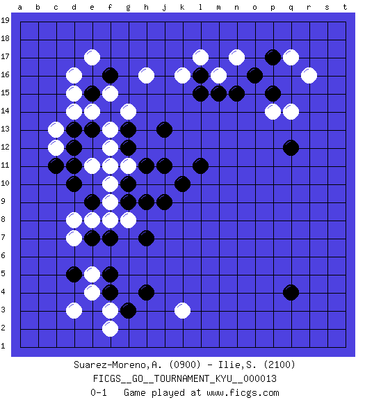 Last move : 0-1 2007 February 3 8:46:53 [Event "FICGS__GO__TOURNAMENT_KYU__000013"] [Site "FICGS"] [Date "2006.12.05"] [Round "1"] [Black "Suarez-Moreno,Alejandro"] [White "Ilie,Sebastian"] [Result "0-1"] [Rating 1 "0900"] [Rating 2 "2100"] 1.q4 r16 2.d5 d15 3.p17 n17 4.p15 q14 5.q12 p14 6.f16 e17 7.e15 d14 8.d10 h16 9.e13 e14 10.f14 f13 11.g13 f12 12.d13 c13 13.d12 c12 14.c11 e11 15.d11 d16 16.n15 g14 17.g12 f15 18.l16 m16 19.m15 l17 20.o16 k16 21.l15 q17 22.j13 g11 23.h11 h10 24.j11 j10 25.l11 f10 26.k10 d8 27.e9 e8 28.g9 f9 29.g10 f11 30.j9 g8 31.h9 d3 32.f4 e4 33.h4 e5 34.f5 f3 35.g3 f2 36.f7 f8 37.e7 d7 38.h7 k3 0-1 Here are the names of the openings (joseki) played in the four corners : Corner q16 : r16 p17 Komoku (Somok, Xiao~mu`) 3-4 Point. The komoku (3-4) point is the traditional corner enclosure move.. Ikken Kakari (Hankan Keolch'im, Yi Gua`jiao~, 1-Space Low Pincer). The small knight move is the basic approach move to the 3-4 point stone. It has been continually used for over four centuries. There are limitless variations, with new moves constantly being discovered. Black 2 opens the door to a treaure store of joseki. Corner d16 : d15 f16 Takamoku (Gomok, Gaomu`) 5-4 Point. The takamoku (high) point (5-4). With its emphasis on influence, the 5-4 point complements the 4-4 (hoshi) point in creating an influence-oriented fuseki. Corner d4 : d5 d8 Takamoku (Gomok, Gaomu`) 5-4 Point. The takamoku (high) point (5-4). With its emphasis on influence, the 5-4 point complements the 4-4 (hoshi) point in creating an influence-oriented fuseki. Player White won this Go (weiqi, baduk) game. Follow this game move after move (download)You have to like to win, and to learn to recognize the errors that gave you the victory. (Pierre Audouard) Don't be discouraged. It's often the last key in the bunch that opens the lock. (Author unknown)