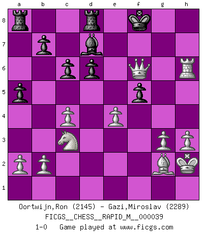 Last move : 1-0 2011 March 6 11:39:23 [Event "FICGS__CHESS__RAPID_M__000039"] [Site "FICGS"] [Date "2011.01.03"] [Round "1"] [White "Oortwijn,Ron"] [Black "Gazi,Miroslav"] [Result "1-0"] [WhiteElo "2145"] [BlackElo "2289"] 1.c4 Nf6 2.Nc3 e5 3.Nf3 Nc6 4.g3 Bc5 5.Nxe5 Bxf2+ 6.Kxf2 Nxe5 7.e4 d6 8.d4 Nc6 9.h3 O-O 10.Be3 Qe7 11.Bg2 h6 12.Rf1 a5 13.Kg1 Bd7 14.Qd2 Qd8 15.Bxh6 gxh6 16.Qxh6 Nxd4 17.Rxf6 Ne6 18.Raf1 c6 19.R1f5 Qb6+ 20.Kh2 Qe3 21.Qxe3 Ng7 22.Rg5 Rfd8 23.Rxg7+ Kxg7 24.Qg5+ Kf8 25.Rh6 f5 26.Qf6+ 1-0 This chess game has been lost on time (started : 2011.01.03 15:46:39) English Opening Kingside Castling by player Black (move 9) Player White won this chess game. Follow this game move after move (download)There are two types of sacrifices: correct ones and mine. (Mikhail Tal) Wenn ich gewinne bin ich ein Genie. Wenn nicht, dann bin ich keines. (Robert James Fischer) ¿Se han dado cuenta de que Fischer casi nunca ha tenido piezas malas? El las intercambia y las piezas malas se quedan con sus oponenets. (Yuri Balashov) On croit qu'il y a plus de mauvais joueurs que de bons joueurs, c'est faux : Il y a autant de joueurs qui gagnent que de joueurs qui perdent. (Philippe Geluck) O divine art of subtlety and secrecy! Through you we learn to be invisible, through you inaudible and hence we can hold the enemy's fate in our hands. (Sun Tzu)