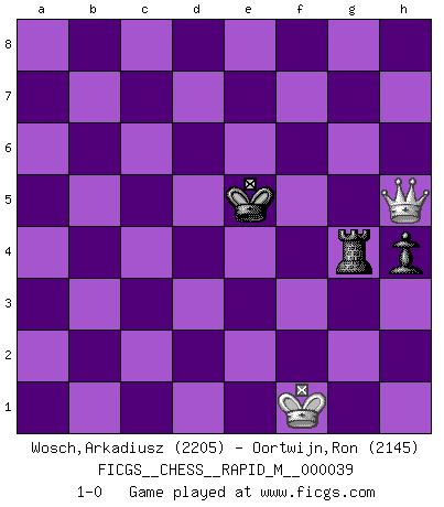 Last move : 1-0 2011 June 21 21:24:38 [Event "FICGS__CHESS__RAPID_M__000039"] [Site "FICGS"] [Date "2011.01.03"] [Round "1"] [White "Wosch,Arkadiusz"] [Black "Oortwijn,Ron"] [Result "1-0"] [WhiteElo "2205"] [BlackElo "2145"] 1.e4 c5 2.Nf3 d6 3.d4 cxd4 4.Nxd4 Nf6 5.Nc3 a6 6.Be2 e6 7.O-O Be7 8.f4 O-O 9.Be3 Nc6 10.a4 Qc7 11.Kh1 Re8 12.Bf3 Nxd4 13.Qxd4 e5 14.Qd2 Bd7 15.a5 Rac8 16.f5 Qc4 17.Rfd1 g6 18.Bg5 Bc6 19.Ra3 Bd8 20.h4 Be7 21.Qf2 gxf5 22.Bxf6 Bxf6 23.Rd5 f4 24.Be2 Bxd5 25.Bxc4 Bxc4 26.Ra1 Kh8 27.Rd1 Rg8 28.Nd5 Bxd5 29.Rxd5 Rg3 30.Rd3 Bxh4 31.Rxg3 Bxg3 32.Qd2 Kg7 33.b3 Rc7 34.Kg1 h6 35.Qd3 Rc6 36.Kf1 Bh4 37.c4 Bf6 38.Kf2 Bh4+ 39.Ke2 Be7 40.b4 h5 41.Qd5 Bd8 42.Kf1 h4 43.Ke2 Kg6 44.Kf3 Kg7 45.Kg4 Kg6 46.c5 Bf6 47.Kh3 dxc5 48.b5 Rc7 49.Qd6 Re7 50.bxa6 bxa6 51.Qxa6 Rd7 52.Qe2 Rd4 53.Qa2 Rd3+ 54.Kh2 Bg5 55.Qa1 f3 56.gxf3 Bf4+ 57.Kh1 Rxf3 58.a6 Rh3+ 59.Kg2 Rg3+ 60.Kf1 Be3 61.Qxe5 c4 62.Qc7 c3 63.a7 Bxa7 64.Qxa7 f6 65.Qc7 Rg4 66.e5 fxe5 67.Qxe5 c2 68.Qd6+ Kf7 69.Qc7+ Kf6 70.Qxc2 Rg5 71.Qc6+ Ke5 72.Qh6 Rg4 73.Qh5+ 1-0 Sicilian : Najdorf, Opovcensky variation Kingside Castling by player White (move 7) Kingside Castling by player Black (move 8) 10 pieces endgame at move 61 : White KQPP , Black KRBPPP WHITE : King + 1 Queen 2 Pawns BLACK : King + 1 Rook 1 Bishop 3 Pawns 9 pieces endgame at move 63 : White KQP , Black KRBPPP WHITE : King + 1 Queen 1 Pawn BLACK : King + 1 Rook 1 Bishop 3 Pawns 8 pieces endgame at move 64 : White KQP , Black KRPPP WHITE : King + 1 Queen 1 Pawn BLACK : King + 1 Rook 3 Pawns 7 pieces endgame at move 66 : White KQ , Black KRPPP WHITE : King + 1 Queen BLACK : King + 1 Rook 3 Pawns 6 pieces endgame at move 67 : White KQ , Black KRPP WHITE : King + 1 Queen BLACK : King + 1 Rook 2 Pawns 5 pieces endgame at move 70 : White KQ , Black KRP WHITE : King + 1 Queen BLACK : King + 1 Rook 1 Pawn Player White won this chess game. Follow this game move after move (download)A Chess game is a dialogue, a conversation between a player and his opponent. Each move by the opponent may contain threats or be a blunder, but a player cannot defend against threats or take advantage of blunders if he does not first ask himself: What is my opponent planning after each move ? (Bruce A. Moon) Karpov ist ein Museumsstück. (Garry Kasparov) Si tu oponente no puede hacer nada activo, entonces no apures la posición; En vez de eso, dejalo estar sentado ahí, sufriendo y rogandote por un empate. (Jeremy Silman) Aux échecs, l'amour-propre est satisfait quand on remporte la victoire, mais il n'y a pas de honte à être battu. (Benjamin Franklin) If we don't succeed, we run the risk of failure. (George W. Bush)