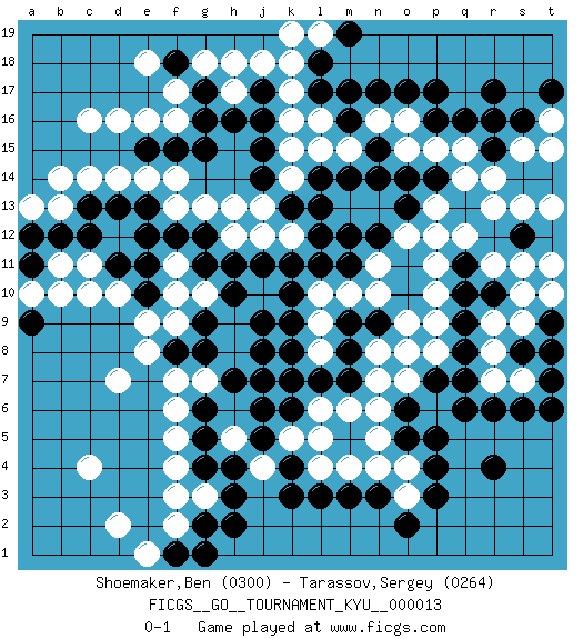 Last move : 0-1 2007 February 11 18:21:48 [Event "FICGS__GO__TOURNAMENT_KYU__000013"] [Site "FICGS"] [Date "2006.12.05"] [Round "1"] [Black "Shoemaker,Ben"] [White "Tarassov,Sergey"] [Result "0-1"] [Rating 1 "0300"] [Rating 2 "0264"] 1.r16 c4 2.r4 c16 3.p3 f3 4.p17 d10 5.q10 f17 6.k4 k17 7.m16 k15 8.h3 d7 9.k10 q12 10.r12 r14 11.p14 r11 12.r10 s11 13.o11 o12 14.m12 r7 15.p7 s10 16.d13 f13 17.e12 f11 18.f12 h12 19.e11 f10 20.g12 g13 21.g11 j12 22.h10 g10 23.h11 h9 24.j9 h8 25.j8 h5 26.j6 d14 27.c13 c14 28.e10 e9 29.h7 g7 30.g9 f9 31.g8 f7 32.f8 e8 33.g6 f6 34.g5 f5 35.g4 f4 36.g2 f2 37.l14 k14 38.l18 k18 39.l17 r9 40.s6 p10 41.q9 r8 42.t9 s7 43.t7 t10 44.r6 q15 45.q16 p15 46.o14 s15 47.s16 p11 48.o10 p9 49.q8 p8 50.q7 s9 51.t8 o8 52.q11 p12 53.s12 r13 54.t12 s13 55.t6 t13 56.s8 t11 57.s12 t16 58.t17 t15 59.r17 n13 60.n14 m13 61.l13 k12 62.l12 l15 63.m14 m15 64.n15 o16 65.o17 n16 66.n17 m10 67.l11 l10 68.k11 n11 69.n9 n10 70.m9 l9 71.m8 l8 72.m7 o7 73.o6 p6 74.q6 n6 75.o5 m6 76.l7 l6 77.k6 m4 78.m3 n4 79.n3 o4 80.p4 n5 81.p5 n7 82.n12 o9 83.k8 o3 84.o2 l4 85.l3 c11 86.o13 b13 87.e13 e14 88.d11 c10 89.b12 b14 90.c12 b11 91.r15 q14 92.p16 o15 93.k13 j13 94.j11 l16 95.m17 g3 96.h2 k5 97.j5 j4 98.k3 k7 99.j7 n8 100.k7 l5 101.h4 l19 102.m19 k19 103.f1 e1 104.g1 d2 105.a11 a10 106.a12 a13 107.j14 h13 108.j15 k16 109.j16 h18 110.g15 f14 111.g17 h17 112.h16 g18 113.g16 f16 114.j17 j18 115.f15 e16 116.f18 e18 117.e15 d16 118.a9 b10 119.m11 p13 120.k9 pass 121.pass pass 122.pass pass 0-1 Comment by player 1 : Ben Shoemaker : I can't believe the server doesn't know when the game is over. Comment by player 2 : Sergey Tarassov : Resign, please. Here are the names of the openings (joseki) played in the four corners : Player White won this Go (weiqi, baduk) game. Follow this game move after move (download)Error is one of the sources of transformation. (Pierre Audouard) Man is reluctant to give credit for intelligence to anyone, except his enemies. (Albert Einstein)