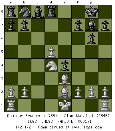 Last move : 1/2-1/2 2011 January 22 12:33:6 [Event "FICGS__CHESS__RAPID_B__000171"] [Site "FICGS"] [Date "2011.01.04"] [Round "1"] [White "Gouldar,Frances"] [Black "Sladotka,Jiri"] [Result "1/2-1/2"] [WhiteElo "1788"] [BlackElo "1845"] 1.d4 Nf6 2.c4 g6 3.Nc3 Bg7 4.e4 d6 5.Nf3 O-O 6.Be2 e5 7.dxe5 dxe5 8.Qxd8 Rxd8 9.Bg5 Re8 10.Nd5 Nxd5 11.cxd5 c6 12.Be3 cxd5 13.exd5 e4 14.Nd4 Rd8 1/2-1/2 King's Indian : Andersson variation Kingside Castling by player Black (move 5) This chess game ended in a draw. Follow this game move after move (download)Bobby Fischer's current state of mind is indeed a tragedy. One of the world's greatest Chess players - the pride and sorrow of American Chess. (Frank Brady) Woher wissen wir, daß der Neanderthaler Blindschach gespielt hat? -- Bei Ausgrabungen wurden keine Schachbretter und Figuren gefunden. (Anonymous) Botvinnik trataba de restarle el misterio al Ajedrez, siempre relacionandolo a situaciones de la vida ordinaria. El gustaba de llamar al Ajedrez un típico problema inexacto similar a aquellos de los cuales la gente siempre tiene que enfrentarse en la vida cotidiana. (Garry Kasparov) Nous vivons dans un monde échiquéen : chaque jour qui passe est un défi à relever. (Philosophe Sasha) I take risks, sometimes patients die, but not taking risks causes more patients to die. So I guess my biggest problem is I've been cursed with the ability to do the math. (Gregory House, House M.D.)