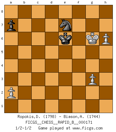 Last move : 1/2-1/2 2011 June 1 16:13:16 [Event "FICGS__CHESS__RAPID_B__000171"] [Site "FICGS"] [Date "2011.01.04"] [Round "1"] [White "Ropokis,Dimitrios"] [Black "Biason,Adriano"] [Result "1/2-1/2"] [WhiteElo "1798"] [BlackElo "1744"] 1.d4 Nf6 2.Nf3 e6 3.c4 b6 4.g3 Ba6 5.b3 Bb4+ 6.Bd2 Be7 7.Bg2 c6 8.Bc3 d5 9.Nbd2 Nbd7 10.O-O O-O 11.Re1 c5 12.e4 dxe4 13.Nxe4 Bb7 14.Nfg5 cxd4 15.Bxd4 Nxe4 16.Nxe4 Qc7 17.Qh5 Rad8 18.Rad1 Bb4 19.Re3 e5 20.Bc3 Bxe4 21.Bxb4 Nf6 22.Qe2 Rxd1+ 23.Qxd1 Rd8 24.Qe2 Bxg2 25.Kxg2 Nd7 26.Ba3 Re8 27.Qf3 Nf6 28.Bb2 h6 29.Qf5 Nd7 30.f3 f6 31.Ba3 Nf8 32.Rd3 Ne6 33.Rd6 Qc8 34.Qg4 b5 35.Qe4 Ng5 36.Qd5+ Kh8 37.Rd7 bxc4 38.bxc4 Qa6 39.Qd3 Qe6 40.Rd8 Rxd8 41.Qxd8+ Kh7 42.Qd3+ f5 43.Qd5 Qa6 44.Bb2 Qa4 45.Qd3 e4 46.fxe4 fxe4 47.Qc3 Qd7 48.h4 Qh3+ 49.Kf2 Qh2+ 50.Kf1 Qh1+ 51.Kf2 Nh3+ 52.Ke3 Qf3+ 53.Kd4 Qf5 54.Ke3 Qg4 55.Qxg7+ Qxg7 56.Bxg7 Kxg7 57.Kxe4 Nf2+ 58.Ke5 Kf7 59.c5 Ke7 60.Kf5 Nd3 61.c6 Nb4 62.c7 Kd7 63.Kg6 Nd5 64.Kxh6 Nxc7 65.h5 Ke6 66.Kg6 Nd5 67.h6 Ne7+ 68.Kg7 Nf5+ 69.Kg6 Ne7+ 1/2-1/2 Queen's pawn game Kingside Castling by player White (move 10) Kingside Castling by player Black (move 10) 10 pieces endgame at move 56 : White KPPPP , Black KNPPP WHITE : King + 4 Pawns BLACK : King + 1 Knight 3 Pawns 9 pieces endgame at move 57 : White KPPPP , Black KNPP WHITE : King + 4 Pawns BLACK : King + 1 Knight 2 Pawns 8 pieces endgame at move 64 : White KPPPP , Black KNP WHITE : King + 4 Pawns BLACK : King + 1 Knight 1 Pawn 7 pieces endgame at move 64 : White KPPP , Black KNP WHITE : King + 3 Pawns BLACK : King + 1 Knight 1 Pawn This chess game ended in a draw. Follow this game move after move (download)If Chess is a science, it's a most inexact one. If Chess is an art, it is too exacting to be seen as one. If Chess is a sport, it's too esoteric. If Chess is a game, it's too demanding to be just a game. If Chess is a mistress, she's a demanding one. If Chess is a passion, it's a rewarding one. If Chess is life, it's a sad one. (Unknown) Mutter, ich bin eben Ex-Weltmeister geworden. --beim nach Hause Kommen nach dem Verlust des WM-Titels an Mihail Botvinnik -- (Mikhail Nekhemyevich Tal) Sin errores no puede haber brillantez. (Emanuel Lasker) Les réformistes prétendent que les progrès de la théorie conduiront à la disparition des échecs, et qu'il faut, pour leur rendre vie, en remanier les règles. En réalité, qu'exprime cette affirmation? Le mépris de l'intuition, de l'imagination et de tous les autres éléments qui font des échecs un art. (Alexander Alekhine) Heh, heh, heh. Time to abandon ship. (General Grievous in Star Wars ep.3)