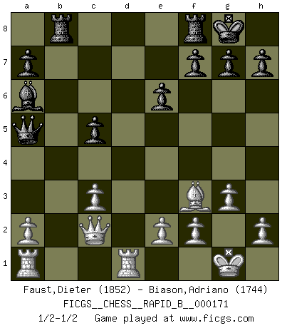 Last move : 1/2-1/2 2011 February 7 22:47:2 [Event "FICGS__CHESS__RAPID_B__000171"] [Site "FICGS"] [Date "2011.01.04"] [Round "1"] [White "Faust,Dieter"] [Black "Biason,Adriano"] [Result "1/2-1/2"] [WhiteElo "1852"] [BlackElo "1744"] 1.d4 Nf6 2.c4 e6 3.Nc3 Bb4 4.Nf3 c5 5.g3 cxd4 6.Nxd4 O-O 7.Bg2 d5 8.cxd5 Nxd5 9.Qb3 Qa5 10.Bd2 Nc6 11.Nxc6 bxc6 12.O-O Bxc3 13.Bxc3 Nxc3 14.bxc3 Ba6 15.Bf3 Rab8 16.Qc2 c5 17.Rfd1 1/2-1/2 Nimzo-Indian : Three knights variation Kingside Castling by player Black (move 6) Kingside Castling by player White (move 12) This chess game ended in a draw. Follow this game move after move (download)One doesn't have to play well, it's enough to play better than your opponent. (Siegbert Tarrasch) Mein erstes Ziel war nicht, die Partie zu gewinnen, sondern eine Figur zu opfern. -- der junge (Wilhelm Steinitz) No solamente yo pronostico su triunfo sobre Botvinnik, sino que me adelanto y digo que probablemente Fischer es el jugador de Ajedrez mas grande que haya existido. (John Collins) Ne tendez aucun piège pour le plaisir ! Ne jouez rien dans l'espoir que l'adversaire réagisse de façon stupide ! Prenez toujours pour acquis que l'adversaire va trouver le meilleur coup ! Ne jouez jamais de coup dans l'espoir que l'adversaire ne voie pas la menace ! Chacun de vos coups doit améliorer la position d'une façon ou d'une autre. Programmer - an organism that turns coffee into software. (Anonymous)