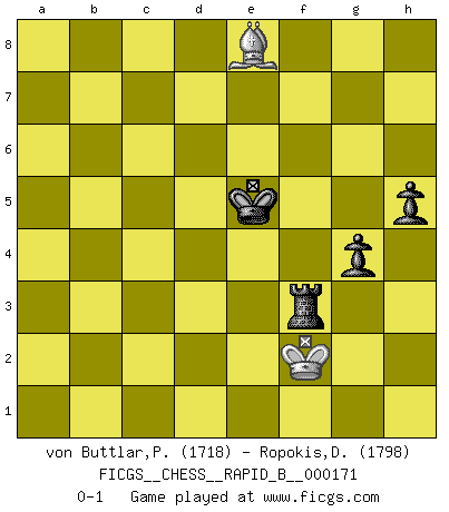 Last move : 0-1 2011 February 2 13:51:21 [Event "FICGS__CHESS__RAPID_B__000171"] [Site "FICGS"] [Date "2011.01.04"] [Round "1"] [White "von Buttlar,Paul"] [Black "Ropokis,Dimitrios"] [Result "0-1"] [WhiteElo "1718"] [BlackElo "1798"] 1.c4 Nf6 2.Nc3 e5 3.Nf3 Nc6 4.e3 Bb4 5.Qc2 Bxc3 6.Qxc3 Qe7 7.a3 d5 8.cxd5 Nxd5 9.Qb3 Nb6 10.d3 O-O 11.Be2 Be6 12.Qc2 a5 13.O-O a4 14.Bd2 Bb3 15.Qc1 Qd6 16.Bc3 Nd5 17.d4 Nxc3 18.bxc3 Rfe8 19.Qb2 Rab8 20.Nd2 Na5 21.Nxb3 axb3 22.h3 b6 23.Rfd1 Red8 24.c4 exd4 25.exd4 g6 26.Qc3 Nc6 27.d5 Na5 28.Rd2 Re8 29.Rb2 Re4 30.Bf1 Qe5 31.Qxe5 Rxe5 32.f3 Kf8 33.Rc1 Ke7 34.f4 Re4 35.c5 Rxf4 36.d6+ Kd7 37.dxc7 Kxc7 38.cxb6+ Kxb6 39.Rd2 Rf6 40.a4 Rc6 41.Rcd1 Nb7 42.Bb5 Rf6 43.Rb1 Nc5 44.Bc4 Ka5 45.Rd5 Kb4 46.Rxc5 Kxc5 47.Bxb3 Kd4 48.Rd1+ Kc3 49.Bd5 Rd8 50.Bf3 Rxd1+ 51.Bxd1 Kb4 52.g3 Rd6 53.Bf3 Kxa4 54.Kf2 Kb4 55.Ke3 Kc5 56.Bb7 Rb6 57.Bg2 Kd6 58.Kf4 Rb4+ 59.Ke3 Ke5 60.Bc6 Rb3+ 61.Kf2 f5 62.Ba8 h5 63.Bc6 Rb2+ 64.Kf3 g5 65.Bd7 g4+ 66.hxg4 fxg4+ 67.Ke3 Rg2 68.Be8 Rxg3+ 69.Kf2 Rf3+ 0-1 English Opening Kingside Castling by player Black (move 10) Kingside Castling by player White (move 13) 10 pieces endgame at move 51 : White KBPPP , Black KRPPP WHITE : King + 1 Bishop 3 Pawns BLACK : King + 1 Rook 3 Pawns 9 pieces endgame at move 53 : White KBPP , Black KRPPP WHITE : King + 1 Bishop 2 Pawns BLACK : King + 1 Rook 3 Pawns 8 pieces endgame at move 66 : White KBPP , Black KRPP WHITE : King + 1 Bishop 2 Pawns BLACK : King + 1 Rook 2 Pawns 7 pieces endgame at move 66 : White KBP , Black KRPP WHITE : King + 1 Bishop 1 Pawn BLACK : King + 1 Rook 2 Pawns 6 pieces endgame at move 68 : White KB , Black KRPP WHITE : King + 1 Bishop BLACK : King + 1 Rook 2 Pawns Player Black won this chess game. Follow this game move after move (download)Chess is a terrible game. If you have no center, your opponent has a freer position. If you do have a center, then you really have something to worry about ! (Siegbert Tarrasch) Wenn ich einen Club besuche, sind die Spieler stumm vor Staunen. (José Raúl Capablanca) Combinaciones deslumbrantes son para la mayoría, mover madera es para los pocos. (Georg Kieninger) Ce qui est bien, c'est d'avoir tout un tas de pièces en prise : l'adversaire ne peut en prendre qu'une à la fois. Cité par Thierry Audin. Don't anthropomorphize computers - they hate it. (Anonymous)