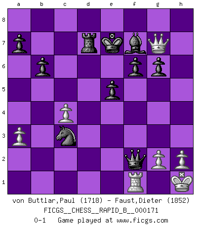 Last move : 0-1 2011 February 13 19:47:58 [Event "FICGS__CHESS__RAPID_B__000171"] [Site "FICGS"] [Date "2011.01.04"] [Round "1"] [White "von Buttlar,Paul"] [Black "Faust,Dieter"] [Result "0-1"] [WhiteElo "1718"] [BlackElo "1852"] 1.c4 Nf6 2.Nc3 e6 3.e4 d5 4.d4 dxe4 5.f3 Bb4 6.a3 Bxc3+ 7.bxc3 c5 8.fxe4 Nxe4 9.Qd3 Qa5 10.Bd2 Nxd2 11.Qxd2 O-O 12.Nf3 Nc6 13.Bd3 Rd8 14.O-O cxd4 15.Ng5 f6 16.Bxh7+ Kh8 17.Nf7+ Kxh7 18.Nxd8 Qxd8 19.Qd3+ Kg8 20.Rad1 e5 21.Qg6 Be6 22.Rf3 Qe7 23.Rg3 dxc3 24.Rxc3 Nd4 25.Qe4 Rd8 26.Kh1 b6 27.Qe3 Kf7 28.Rdc1 Qc5 29.Qe4 g6 30.Qb7+ Rd7 31.Qa8 Ne2 32.Qh8 Nxc3 33.Qh7+ Kf8 34.Qh8+ Ke7 35.Qg7+ Bf7 36.Rf1 Qf2 0-1 English : Mikenas-Carls variation Kingside Castling by player Black (move 11) Kingside Castling by player White (move 14) Player Black won this chess game. Follow this game move after move (download)After black's reply to 1.e4 with 1..e5, leaves him always trying to get into the game. (Howard Staunton) Spiel ein langweiliges Spiel zu Ende und lustige Dinge können passieren. (Hans Ree) Un buen sacrificio es aquel que aunque no sea necesariamente sólido, deja a tu oponente aturdido y confuso. (Rudolph Spielmann) J'ai toujours senti une vague pitié pour l'homme qui ne connaît rien aux échecs, tout comme j'en aurais pour un homme ignorant de l'amour. Les Echecs, comme la musique ou comme l'amour, ont le pouvoir de rendre heureux. (Siegbert Tarrasch) Memory is a crazy woman that hoards colored rags and throws away food. (Austin O'Malley)