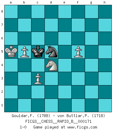 Last move : 1-0 2011 February 17 18:13:44 [Event "FICGS__CHESS__RAPID_B__000171"] [Site "FICGS"] [Date "2011.01.04"] [Round "1"] [White "Gouldar,Frances"] [Black "von Buttlar,Paul"] [Result "1-0"] [WhiteElo "1788"] [BlackElo "1718"] 1.e4 e6 2.d4 d5 3.Nc3 Bb4 4.e5 c5 5.Bd2 a6 6.Qg4 g6 7.a3 Bxc3 8.Bxc3 Nc6 9.dxc5 d4 10.O-O-O Qe7 11.Bxd4 Nxd4 12.Qxd4 Bd7 13.Nf3 Rc8 14.Qd6 Rxc5 15.Qb8+ Bc8 16.Rd2 Nh6 17.Bd3 O-O 18.Rhd1 b5 19.Be4 Rc4 20.Rd4 Rxd4 21.Rxd4 f5 22.exf6 Qxf6 23.h3 Nf5 24.Rd3 Ne7 25.Bb7 Qf5 26.Bxc8 Rxc8 27.Rd8+ Rxd8 28.Qxd8+ Qf8 29.Qd6 Qf6 30.Qxa6 b4 31.axb4 Qf4+ 32.Kb1 Qxb4 33.Qxe6+ Kg7 34.h4 Nf5 35.Qe5+ Kh6 36.Qe2 Kg7 37.g3 Qb7 38.h5 Qd5 39.hxg6 hxg6 40.Qe5+ Qxe5 41.Nxe5 Kf6 42.Nc4 Ke6 43.Ne3 Nd4 44.c3 Nc6 45.Nc2 Ke5 46.Nd4 Na5 47.b4 Nc4 48.f3 Ne3 49.b5 Kd5 50.Ka2 Kc5 51.Kb3 Nf1 52.g4 Nd2+ 53.Ka4 Nc4 54.f4 Ne3 55.f5 gxf5 56.gxf5 Nd5 57.Ka5 1-0 French : Winawer, Advance, Bogolyubov variation Queenside Castling by player White (move 10) Kingside Castling by player Black (move 17) 10 pieces endgame at move 40 : White KNPPPP , Black KQNP WHITE : King + 1 Knight 4 Pawns BLACK : King + 1 Queen 1 Knight 1 Pawn 9 pieces endgame at move 41 : White KNPPPP , Black KNP WHITE : King + 1 Knight 4 Pawns BLACK : King + 1 Knight 1 Pawn 8 pieces endgame at move 55 : White KNPPP , Black KNP WHITE : King + 1 Knight 3 Pawns BLACK : King + 1 Knight 1 Pawn 7 pieces endgame at move 56 : White KNPPP , Black KN WHITE : King + 1 Knight 3 Pawns BLACK : King + 1 Knight Player White won this chess game. Follow this game move after move (download)A win by an unsound combination, however showy, fills me with artistic horror. (Wilhelm Steinitz) Je mehr ich von der FIDE weiss, um so weniger verstehe ich. (Alexander Kalifman) Juega la Apertura como un libro, el Juego Medio como un mago y los Finales como una máquina. (Spielmann) À la honte des hommes, on sait que les lois du jeu sont les seules qui soient partout justes, claires, inviolables et exécutées. Pourquoi l'Indien qui a donné les règles du jeu d'échecs est-il obéi de bon gré dans toute la terre, et que les décrétales des papes, par exemple, sont aujourd'hui un objet d'horreur et de mépris ? C'est que l'inventeur des échecs combina tout avec justesse pour la satisfaction des joueurs, et que les papes, dans leurs décrétales, n'eurent en vue que leur seul avantage. L'Indien voulut exercer également l'esprit des hommes et leur donner du plaisir; les papes ont voulu abrutir l'esprit des hommes. Voltaire (Dictionnaire philosophique / Garnier 1967) There are two types of people in this world, good and bad. The good sleep better, but the bad seem to enjoy the waking hours much more. (Woody Allen)