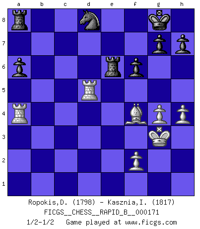 Last move : 1/2-1/2 2011 January 26 10:16:2 [Event "FICGS__CHESS__RAPID_B__000171"] [Site "FICGS"] [Date "2011.01.04"] [Round "1"] [White "Ropokis,Dimitrios"] [Black "Kasznia,Ireneusz"] [Result "1/2-1/2"] [WhiteElo "1798"] [BlackElo "1817"] 1.d4 Nf6 2.Nf3 e6 3.g3 d5 4.Bg2 c5 5.O-O Nc6 6.c4 dxc4 7.Qa4 cxd4 8.Qxc4 Qb6 9.e3 dxe3 10.Bxe3 Qxb2 11.Nd4 Nxd4 12.Bxd4 Qb4 13.Qd3 Be7 14.Nc3 O-O 15.Rfb1 Qd6 16.Rd1 e5 17.Nb5 Qb8 18.Bb2 Bd7 19.Rac1 Bc6 20.Qe2 a6 21.Bxc6 bxc6 22.Na3 Bxa3 23.Bxa3 Re8 24.Rxc6 Qb7 25.R1d6 Qb1+ 26.Rc1 Qe4 27.Re1 Qa4 28.Bb2 Qxa2 29.Ra1 Qb3 30.Bxe5 Qb4 31.Qf3 Ne4 32.Rd7 Ng5 33.Qd5 Qb5 34.Kg2 Qxd5+ 35.Rxd5 f6 36.Bf4 Nf7 37.h4 Re7 38.g4 Re6 39.Kg3 Nd8 40.Ra4 1/2-1/2 Queen's pawn game Kingside Castling by player White (move 5) Kingside Castling by player Black (move 14) This chess game ended in a draw. Follow this game move after move (download)It is no time to be playing Chess when the house is on fire. (Italian Proverb) Karpov ist ein Museumsstück. (Garry Kasparov) Cuando me preguntan: -¿Cual es el secreto que te hace hacer mejores movidas que tus oponentes?, Yo respondo: Me da gusto que me pregunten eso, porque, como veran, hay una simple razón. Yo pienso mis propias movidas y dejo a mi oponente que el piense las suyas. (Alexander Alekhine) Les Echecs, c'est l'art de la guerre sans les charniers, c'est la résurrection des morts tombés au champ d'honneur, l'espoir perpétuel, la suprématie de l'intelligence sur la force, la culture de l'esprit. (F. Szpiner) You can't play chess if you're groggy from pills. (Anatoly Karpov)