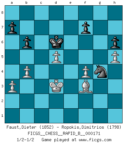 Last move : 1/2-1/2 2011 March 7 9:38:40 [Event "FICGS__CHESS__RAPID_B__000171"] [Site "FICGS"] [Date "2011.01.04"] [Round "1"] [White "Faust,Dieter"] [Black "Ropokis,Dimitrios"] [Result "1/2-1/2"] [WhiteElo "1852"] [BlackElo "1798"] 1.d4 Nf6 2.c4 e5 3.dxe5 Ne4 4.Nf3 Bb4+ 5.Bd2 Nxd2 6.Nbxd2 Nc6 7.a3 Bxd2+ 8.Qxd2 O-O 9.O-O-O Re8 10.Qf4 Qe7 11.Rd5 b6 12.g3 Bb7 13.Bh3 d6 14.exd6 cxd6 15.Rxd6 Na5 16.Rd7 Qf8 17.Rhd1 Re4 18.Qd6 Rxc4+ 19.Kb1 Be4+ 20.Ka2 Bc6 21.Rd8 Rxd8 22.Qxd8 Rc5 23.Rd2 Rc1 24.Ng5 Bb5 25.b4 Rc2+ 26.Rxc2 Qxd8 27.Rc8 Qxc8 28.Bxc8 Nc4 29.Bf5 h6 30.Ne4 Bc6 31.Nc3 Nd6 32.Bc2 g5 33.e4 Nc4 34.Nd5 Kg7 35.Kb3 Ne5 36.h4 gxh4 37.gxh4 Bxd5+ 38.exd5 Kf8 39.Kc3 Ke7 40.f4 Nf3 41.h5 Kd6 42.Be4 Nh2 43.Kd3 Ng4 44.Bf3 1/2-1/2 Budapest : Fajarowicz variation Kingside Castling by player Black (move 8) Queenside Castling by player White (move 9) This chess game ended in a draw. Follow this game move after move (download)I know people who have all the will in the world, but still can't play good Chess. (Bobby Fischer) Ich war zu klein für die Schach-Schülermannschaft! (Woody Allen) Debemos de asegurarnos de que el Ajedrez no se convierta en un lenguaje muerto, muy interesante, pero solo para un grupo muy pequeño. (Sytze Faber) On n'a jamais que l'âge auquel on a commence à jouer aux échecs car après on cesse de vieillir. (Capablanca) Internet: Absolute communication, absolute isolation. (Paul Carvel)