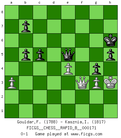 Last move : 0-1 2011 March 7 21:18:36 [Event "FICGS__CHESS__RAPID_B__000171"] [Site "FICGS"] [Date "2011.01.04"] [Round "1"] [White "Gouldar,Frances"] [Black "Kasznia,Ireneusz"] [Result "0-1"] [WhiteElo "1788"] [BlackElo "1817"] 1.d4 Nf6 2.c4 e6 3.Nc3 d5 4.Bg5 Nbd7 5.e3 c6 6.cxd5 exd5 7.Nf3 Qa5 8.Bd3 Ne4 9.Qc2 Nxg5 10.Nxg5 h6 11.Nf3 Bd6 12.O-O Nf6 13.Rfe1 O-O 14.a3 Bg4 15.Nd2 Rae8 16.h3 Bc8 17.Nb3 Qd8 18.Rad1 Bc7 19.Bf5 Bxf5 20.Qxf5 Qd6 21.g3 Bb6 22.Kg2 Re7 23.Re2 g6 24.Qc2 Ne4 25.Nxe4 dxe4 26.Nd2 Rfe8 27.Nc4 Qd5 28.Nxb6 axb6 29.Red2 Rd7 30.Rc1 Qd6 31.Qb3 b5 32.h4 Qe7 33.h5 Rd5 34.hxg6 fxg6 35.Rc5 Red8 36.Rdc2 Qf7 37.Rxd5 Qf3+ 38.Kg1 Qd1+ 39.Kg2 Rxd5 40.Rc3 Qf3+ 41.Kg1 Kh7 42.Rc5 Rxd4 43.Rc1 Rd5 44.Qb4 Rd7 45.Qc5 Qf6 46.Qc2 Qf5 47.Qe2 h5 48.Kg2 Rd3 49.Rc3 Qd7 50.Rc2 Rd1 51.f4 exf3+ 52.Qxf3 Rd2+ 53.Rxd2 Qxd2+ 54.Kh3 Qxb2 55.e4 Kg7 56.Qd3 Qe5 57.Qd7+ Kh6 58.Qd2+ g5 59.Qe3 c5 60.Qf3 g4+ 0-1 Queen's pawn game Kingside Castling by player White (move 12) Kingside Castling by player Black (move 13) Player Black won this chess game. Follow this game move after move (download)I guess a certain amount of temperament is expected of Chess geniuses. (Ron Gross) Wenn ich gewinne bin ich ein Genie. Wenn nicht, dann bin ich keines. (Robert James Fischer) Tu sabes que vas a perder. Aún cuando tenía la ventaja, yo sabía que iba a perder. - al estar jugando con Fischer (Andrew Soltis) Je menace de comprendre la position. (Anonyme) Faith : not wanting to know what is true. (Friedrich Nietzsche)