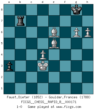 Last move : 1-0 2011 June 16 16:20:58 [Event "FICGS__CHESS__RAPID_B__000171"] [Site "FICGS"] [Date "2011.01.04"] [Round "1"] [White "Faust,Dieter"] [Black "Gouldar,Frances"] [Result "1-0"] [WhiteElo "1852"] [BlackElo "1788"] 1.d4 d5 2.c4 e6 3.Nc3 Nf6 4.cxd5 exd5 5.Bg5 Be7 6.e3 O-O 7.Bd3 h6 8.Bh4 c6 9.Nge2 Re8 10.a3 Be6 11.O-O Nbd7 12.Nf4 Qb6 13.Qc2 Rad8 14.Na4 Qc7 15.Nxe6 fxe6 16.f3 Bd6 17.f4 a5 18.Rf3 Be7 19.Rc1 Rb8 20.Be1 b5 21.Nc3 Qa7 22.Ra1 a4 23.Bg3 Bd6 24.Re1 Rf8 25.Rd1 Nb6 26.Bf2 Qb7 27.Qe2 Rbe8 28.e4 dxe4 29.Nxe4 Qc7 30.Nxf6+ Rxf6 31.Qe4 Kf8 32.Qh7 Nc4 33.Be4 Nxb2 34.Rc1 Nc4 35.Bh4 g5 36.fxg5 Rxf3 37.Qxh6+ Qg7 38.Bxf3 Bxa3 39.Rf1 Qxh6 40.Bxc6 Kg8 41.gxh6 Rb8 42.Rf3 Bf8 43.Rg3+ Kf7 44.h7 Bd6 45.Bxb5 Bxg3 46.Bxg3 Rh8 47.Bxc4 Rxh7 48.Be5 Ke7 49.Kf2 a3 50.Ke3 Rf7 51.g4 Rf8 52.g5 Kf7 53.h4 Rc8 54.Kd3 Rc6 55.h5 Kg8 56.g6 Rb6 57.h6 Rb7 58.Bxe6+ 1-0 QGD : Exchange, positional line Kingside Castling by player Black (move 6) Kingside Castling by player White (move 11) 10 pieces endgame at move 47 : White KBBPPP , Black KRPP WHITE : King + 2 Bishops 3 Pawns BLACK : King + 1 Rook 2 Pawns 9 pieces endgame at move 58 : White KBBPPP , Black KRP WHITE : King + 2 Bishops 3 Pawns BLACK : King + 1 Rook 1 Pawn Player White won this chess game. Follow this game move after move (download)A passed Pawn increases in strength as the number of pieces on the board diminishes. (Capablanca) Jeder Schachmeister war einmal ein Anfänger. (Irving Chernev) Cuando la partida de Ajedrez termina, el Peón y el Rey regresan a la misma caja. (Irish saying) J'ai vu le vaincu d'Echecs jouer des années durant dans l'espoir de la fête de la victoire. Car tu es plus riche de ce qu'elle existe si même elle n'est point pour toi. Ainsi de la perle du fond des mers. (Antoine de Saint-Exupéry) Mac users swear by their computers. PC users swear at their computers. (Author unknown)