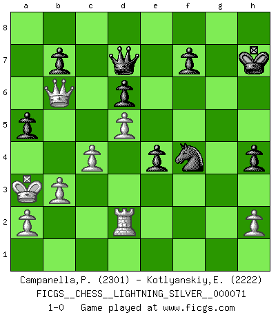 Last move : 1-0 2011 January 5 2:5:49 [Event "FICGS__CHESS__LIGHTNING_SILVER__000071"] [Site "FICGS"] [Date "2011.01.05"] [Round "1"] [White "Campanella,Paul"] [Black "Kotlyanskiy,Edward"] [Result "1-0"] [WhiteElo "2301"] [BlackElo "2222"] 1.e4 c5 2.Nc3 d6 3.Nf3 Nf6 4.d4 cxd4 5.Nxd4 a6 6.f3 e5 7.Nb3 Be6 8.Be3 Be7 9.Qd2 h5 10.Nd5 Nxd5 11.exd5 Bf5 12.Bd3 Bxd3 13.Qxd3 O-O 14.O-O-O Bg5 15.Rhg1 Nd7 16.g4 h4 17.Nd2 Bxe3 18.Qxe3 Qc7 19.g5 Rfc8 20.c3 Nf8 21.Rg4 Ng6 22.Nc4 Rd8 23.Nb6 Rab8 24.Rc4 Qe7 25.f4 Re8 26.f5 Nf4 27.f6 gxf6 28.gxf6 Qxf6 29.Nd7 Qf5 30.Nxb8 Rxb8 31.Rd2 a5 32.b3 Rc8 33.Rxc8+ Qxc8 34.Kb2 Qd7 35.Qb6 e4 36.c4 Kh7 37.Ka3 1-0 Sicilian : Closed Kingside Castling by player Black (move 13) Queenside Castling by player White (move 14) Player White won this chess game. Follow this game move after move (download)The chessboard is the world, the pieces are the phenomena of the Universe, the rules of the game are what we call the laws of Nature and the player on the other side is hidden from us. (Thomas Huxley) Sehr viele beherrschen heutzutage das große Einmalseins des Schachspiels und kennen sogar dessen Logarithmentafeln auswendig - deshalb sollte man hin und wieder zu beweisen trachten, dass zwei mal zwei auch fünf sein kann. (Mikhail Nekhemyevich Tal) Tu eres para mi la Reina en d8 y yo soy el Peón en d7!!. (GM Eduard Gufeld) Le joueur d'Echecs qui veut atteindre le top est obligé de développer son propre credo créatif. Alexeï Stepanovicth Souétine. Il est facile d'écrire des livres ! Ce qui est difficile, c'est de jouer ! (Alexeï Stepanovicth Souétine) Experiences are the keys to life. (Daniel Parmet)